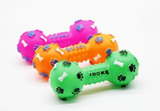 Вінілова іграшка-жувалка для цуценят і дорослих собак середніх і великих розмірів. Іграшка з пищалкою і має форму гантелі. Допомагає очищати зуби, масажувати ясна і особливо необхідні цуценяті в період зміни зубів. Вбудована пищалка пробуджує інтерес собаки до іграшки і мотивує до гри