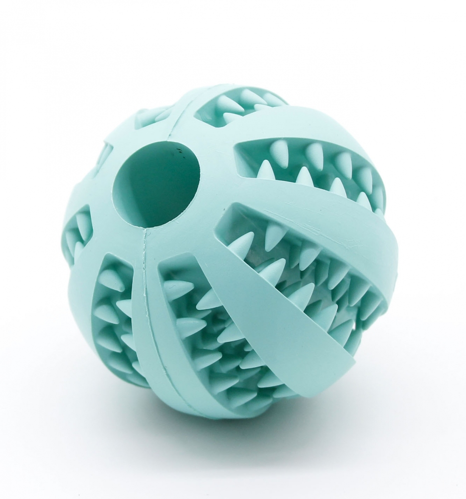 Іграшка з особливими шипами для масажу ясен і додаткового догляду за порожниною рота собаки. Мячик має рельєфні вставки, які при гризінні собакою сприяють очищенню зубів і профілактиці утворення зубного нальоту і зубного каменю. У поздовжні рельєфні області можна помістити шматочки ласощів або корму, що сприятиме привчанню собаки до жування спеціальних іграшок, а не предметів інтерєру, плюс приємний бонус для вашого вихованця, коли він залишається один. Виготовлений мяч з натурального каучуку має ментоловий аромат і повністю безпечний для здоровя собаки.