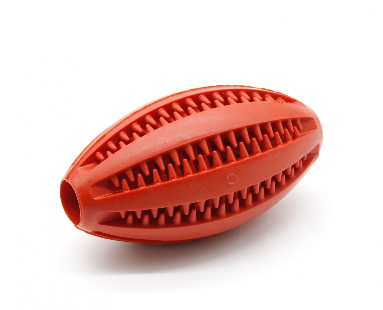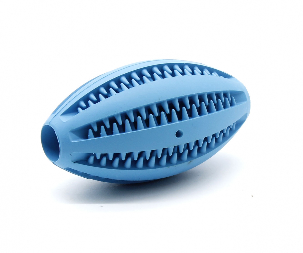 Іграшка з особливими шипами для масажу ясен і додаткового догляду за порожниною рота собаки. Регбімає рельєфні вставки, які при гризінні собакою сприяють очищенню зубів і профілактиці утворення зубного нальоту і зубного каменю. У поздовжні рельєфні області можна помістити шматочки ласощів або корму, що сприятиме привчанню собаки до жування спеціальних іграшок, а не предметів інтерєру, плюс приємний бонус для вашого вихованця, коли він залишається один. Виготовлений мяч з натурального каучуку має ментоловий аромат і повністю безпечний для здоровя собаки.