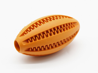 Іграшка з особливими шипами для масажу ясен і додаткового догляду за порожниною рота собаки. Регбімає рельєфні вставки, які при гризінні собакою сприяють очищенню зубів і профілактиці утворення зубного нальоту і зубного каменю. У поздовжні рельєфні області можна помістити шматочки ласощів або корму, що сприятиме привчанню собаки до жування спеціальних іграшок, а не предметів інтерєру, плюс приємний бонус для вашого вихованця, коли він залишається один. Виготовлений мяч з натурального каучуку має ментоловий аромат і повністю безпечний для здоровя собаки.