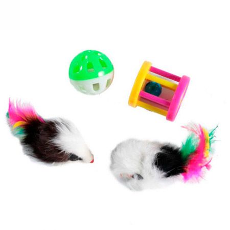 Набір іграшки для кошекСостоит з двох кольорових мишок, кулькою і барабаном з брязкальцями.Виконані з безпечних матеріалів для кігтів і зубів вусатого улюбленця.Буде цікавий як кошенятам, так і дорослим котам.В асортименті різні кольори