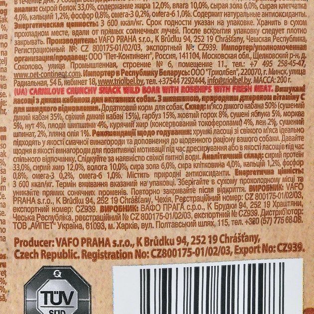 Carnilove (Карнилав) Crunchy Wild Boar with Rosehips - беззерновое ласощі для собак усіх порід (дикий кабан)СМАЧНЕ ЛАСОЩІ З ДИКИМ КАБАНОМ ДЛЯ АКТИВНИХ СОБАК. З ШИПШИНОЮ, НАТУРАЛЬНИМ ДЖЕРЕЛОМ ВІТАМІНУ С, ДЛЯ ШВИДКОГО ВІДНОВЛЕННЯ.СКЛАДдикий кабан 50 (сушений дикий кабан 35, свіжий дикий кабан 15), гарбуз 15, жовтий горох 8, сушене яблуко 5, моркву 5, нут 4, шипшина 4, курячий жир (консервирован токоферолами) 4, лляне насіння 2, сушений шпинат, 2, лляна олія 1.АНАЛІТИЧНІ КОМПОНЕНТИ НА 1 КГсирий білок 33,0, вміст жиру 12,0, волога 10,0, сира зола 6,0, сира клітковина 4,0, кальцій-1,2, фосфор 0,8, жирні кислоти омега-3 0,2, жирні кислоти омега-6 1,0. Містить натуральні антиоксиданти.ВИКОРИСТОВУВАНА ЕНЕРГІЯ3 600 ккалкг