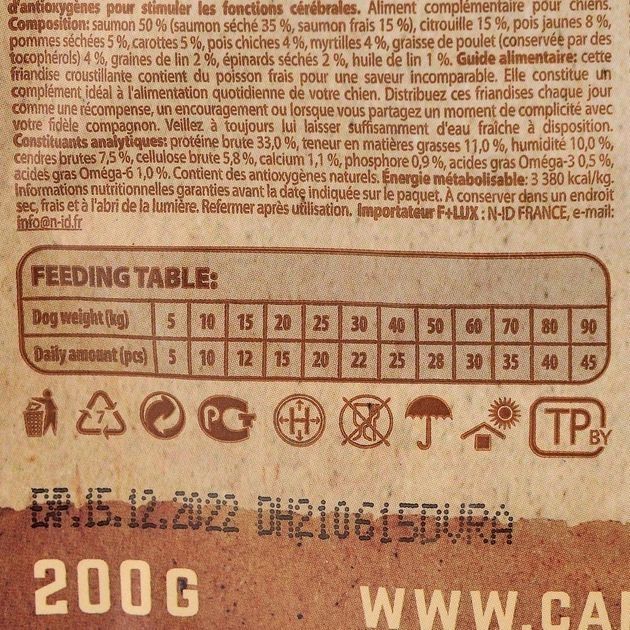 Carnilove (Карнилав) Crunchy with Salmon Blueberries - беззерновое ласощі для собак усіх порід (лосось)СМАЧНЕ ЛАСОЩІ З ЛОСОСЕМ ДЛЯ СОБАК ВСІХ ПОРІД. МІСТИТЬ ЧОРНИЦЮ, НАТУРАЛЬНИЙ ДЖЕРЕЛО АНТИОКСИДАНТІВ ПОЛІПШУЄ РОБОТУ ГОЛОВНОГО МОЗКУ.СКЛАДлосось 50 (сушений лосось 35, свіжий лосось 15), гарбуз 15, жовтий горох 8, сушене яблуко 5, моркву 5, нут 4, чорниця 4, курячий жир (збережений за допомогою суміші токоферолів) 4, лляне насіння 2, сушений шпинат 2, лляна олія 1.АНАЛІТИЧНІ КОМПОНЕНТИ НА 1 КГсирий білок 33,0, вміст жиру 11,0, волога 10,0, сира зола 7,5, сира клітковина 5,8, кальцій 1,1, фосфор 0,9, жирні кислоти омега-3 0,5, жирні кислоти омега-6 1,0. Містить натуральні антиоксиданти.ВИКОРИСТОВУВАНА ЕНЕРГІЯ3 380 ккалкг