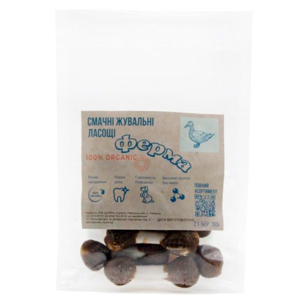 Апетитні ласощі для собак з мяса качки, які збагачені кальцієм, що особливо необхідне собакам для формування міцних кісток та зубів.Апетитно та корисно .Ласощі будуть особливо корисні щенятам і молодим собакам, що ростуть, в період формування кісткової системи. Низький вміст жиру та високий вміст білка дозволить дотримуватись дієти та підтримувати оптимальну масу тварини.