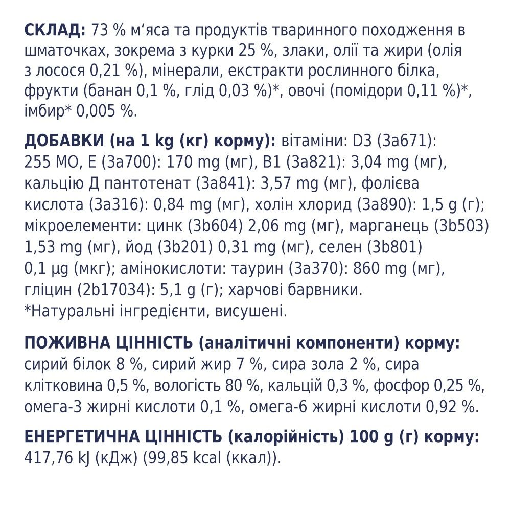 Преміум-раціон для цуценят з куркою в желе - це продукт, який містить безліч корисних речовин, вітамінів і мінералів. Якщо ви шукаєте збалансоване і смачне харчування для свого улюбленця, то вологий корм Клуб 4 Лапи Паппі з куркою для цуценят - відмінний вибір за доступною ціноюПоєднуйтесухий корм для собак Club 4 Pawsі ніжні консерви. Такий підхід дає змогу забезпечити максимальну різноманітність щоденного меню.Збалансований вологий корм з куркою в желе Club 4 Paws Puppies All Breeds with Chicken для цуценят і юніорівСклад містить високоякісні білки, жири, вуглеводи та інші поживні речовини, необхідні для здоровя і росту вашого вихованця:Вітамін D3: допомагає регулювати рівень кальцію та фосфору в крові, що сприяє здоровю кісток і зубів.Залізо: необхідний мінерал, який допомагає створювати гемоглобін у крові та забезпечує тканинам організму достатню кількість кисню.Цинк: допомагає підтримувати здоровя шкіри та шерсті, зміцнює імунну систему та підтримує здоровя очей.Магній: необхідний для здоровя кісток і зубів, а також бере участь у метаболізмі енергії та білків.Калій: допомагає підтримувати здорове серцево-судинне функціонування, а також регулює рівень рідини в організмі.Вологий корм Club 4 Paws з куркою для цуценят не містить барвників та ароматизаторів. Харчування має ніжну текстуру і насичений мясний смак. Провідні ветеринарні лікарі залишають позитивні відгуки про даний раціон. Скористайтеся зручною таблицею годування, для того щоб розрахувати оптимальний розмір порції корму на день.На сайті зібрані різноманітні вологі та сухі раціон для тварин. Всі вони доступний з швидкою доставкою по Києву та Україні. Побалуйте свого пухнастого гурмана Купіть вологий корм Клуб 4 Лапи Паппі з куркою для цуценят в інтернет-зоомагазині Petslike.Інгредієнти73 мяса та продуктів тваринного походження в шматочках, зокрема з курки 25 , злаки, олії та жири (олія з лосося 0,21 ), мінерали, екстракти рослинного білка, фрукти (банан 0,1 , глід 0,03 ), овочі (помідори 0,11 ), імбир 0,005 .