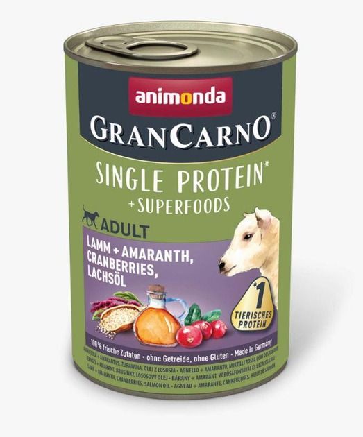 Опис Консерва для собак Animonda GranCarno ягняамарантжуравлина лососева олія 400 гGranCarno Adult Multi-Meat Cocktail вологий корм із свіжих мясних інгредієнтів, що дає неперевершену насолоду для собак. Цей раціон був розроблений для задоволення харчових потреб улюбленців від 1 до 6 років. GranCarno Adult Multi-Meat Cocktail забезпечує вашого вихованця всіма необхідними поживними речовинами, яких він щодня потребує. Задоволення собаки від комбінації кількох видів мяса змусить будь-якого чотирилапого друга спорожнити миску миттєво. GranCarno Adult Multi-Meat Cocktail виробляється в Німеччині, не містить злаків, сої та цукру.Особливості корму:100 свіжі мясні інгредієнти: яловичина, курка, індичка, дичина є природним джерелом кальцію без зерна, без сої, без цукру без штучних барвників та консервантів для собак від 1 до 6 років.Смачний вологий корм GranCarno свіже мясо, як люблять собакиРекомендації щодо годування:вираховуючи потрібну кількість корму для собак, завжди слід враховувати вагу, вік і темперамент вихованця. Для орієнтиру можна використовувати такі рекомендовані кількості: якщо собака важить 3 кг, то їй можна давати 210 г корму на добу якщо собака має вагу 7 кг, вона має отримувати 400 г вологого корму на добу з вагою 15 кг 800 г корму Собаці вагою 30 кг можна дати 1180 г корми. Склад: 38 яловичина (легкі, мясо, печінка, нирки, вимя, серце), 18 курка (серце, шия, шлунок), 6 серце індички, 6 мясо дичини, карбонат кальцію, хлорид натрію.Аналітичний склад:білок 11, жир 8.5, сира клітковина 0.5, сира зола 1.8, вологість 77.Харчові добавки:0.75 мг безводний йодат кальцію (3b202), 14 мг сульфат марганцю моногідрат (3b503), 25 мг моногідрат сульфату цинку (3b605).