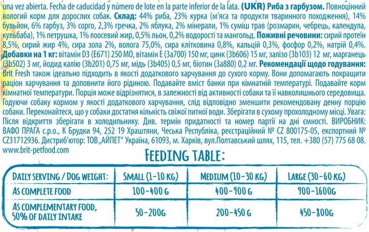 Корм із високим вмiстом незамороженого мяса збагачений сумішшю трав для собак будь-яких порід і вікових груп. Повнораціонний корм для собак. Збагачений сумішшю корисних трав. Високий вміст якісного мяса, яке не піддавалося заморожуванню, і його щадне оброблення є гарантією чудового смаку та запаху. Задовольнить смаки навіть найвибагливіших собак-гурманів.Brit Fresh це ідеальна добавка до гранульованого корму. Допомагає поліпшити приймання корму та заповнити втрату рідини. БЕЗ ГЛЮТЕНУ БЕЗ СОЇ БЕЗ ГМО БЕЗ КОНСЕРВАНТІВ БЕЗ БАРВНИКІВСклад:44 риба, 23 курка, 14 бульйон, 6 гарбуз, 3 сорго, 2.3 гречка, 2 яблука, 2 мінерали, 1 суміш трав (розмарин, чебрець, календула, кульбаба), 1 лососева олія, 1 петрушка, 0.5 насіння льону, 0.2 водорості та мангольд.Чиста вага:0.4 кг