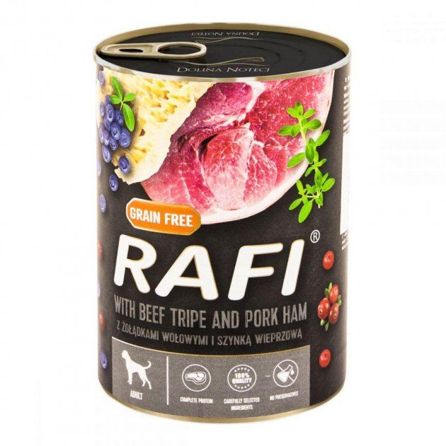 Dolina Noteci Rafi з яловичиною і шинкою, лохиною і журавлиною для дорослих собак всіх порід.Вологий корм з яловичини Dolina Noteci Rafi відрізняється високим вмістом легкозасвоюваного протеїну з низьким вмістом жиру. Крім того, мясо та сировина, отримані з яловичини, є цінним джерелом лізину і гістидину. Важливими речовинами також є жирні кислоти сімейства Омега-3 і Омега-6, які регулюють роботу багатьох життєво важливих функцій організму дорослих собак.Їжа містить залізо, яке забезпечує правильний метаболізм в крові, а також селен і цинк, що покривають добову потребу в цих інгредієнтів. Рецепт був збагачений додаванням чорниці та журавлини, які, завдяки присутніх в них біологічно активних сполук, в основному процианидинам і флавоноїдам, володіють сильними антиоксидантними і протизапальними властивостями. Чебрець, в свою чергу, має антибактеріальну дію і позитивно впливає на функції травлення.Основні переваги:Беззерновая формула Легкозасвоюваний білок і ненасичені жирні кислоти - необхідні інгредієнти для правильного функціонування організму собаки Лляне масло, яке є джерелом жирних кислот Омега-3 і Омега-6, вітаміну Е та ряду біологічно активних сполук з протизапальними властивостями, а також цінних фітостеринів, поліпшують роботу травного тракту Фрукти (лохина і журавлина) з сильними антиоксидантними і протизапальними свойствамиТимьян стимулює секрецію травних соків і додатково покращує смакові якості собачої їжі. Корм Долина Нотечи Рафі повністю забезпечує собаку необхідними поживними речовинами, енергією, вітамінами і мінералами.