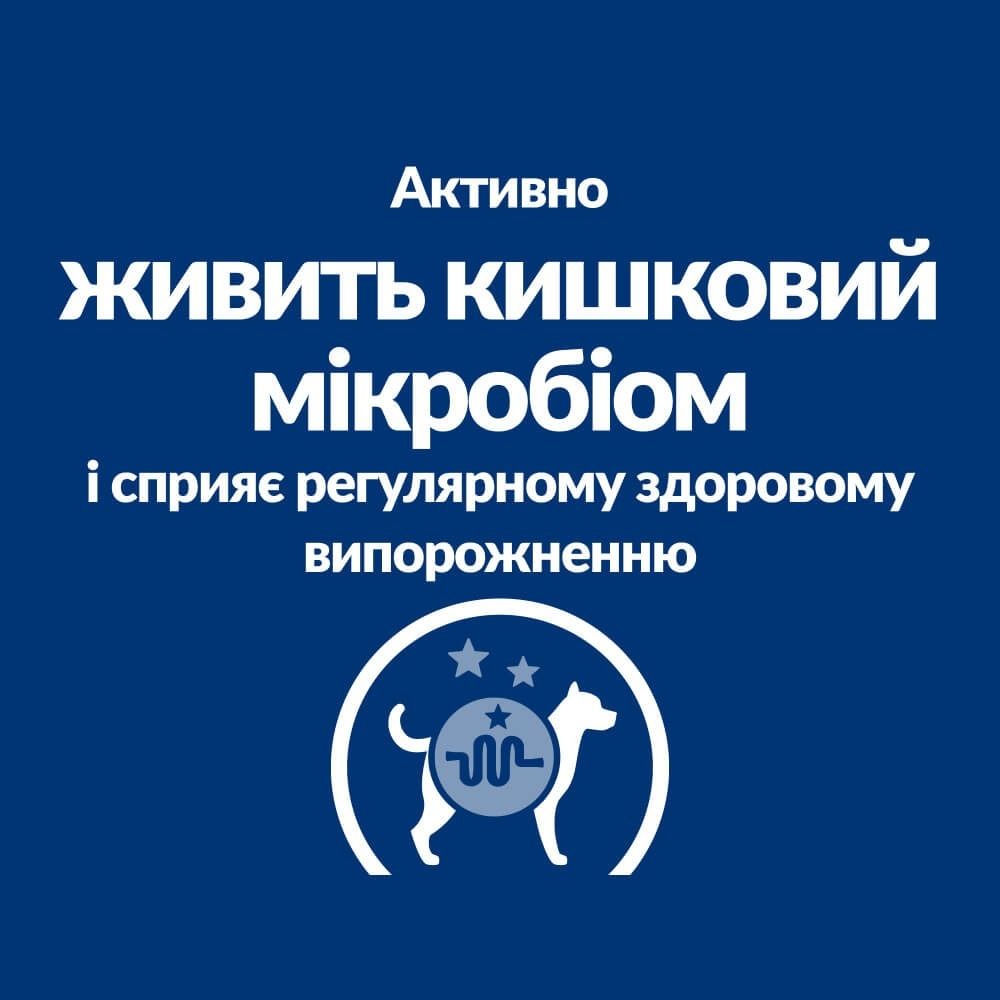 Вологий корм для собакHills PRESCRIPTION DIET Gastrointestinal Biome повнораціонне дієтичне харчування, спеціально розроблене дієтологами та ветеринарними лікарями для покращення травлення, якості й регулярності випорожнень і запобігання рецидивів шлунково-кишкових розладів.Із високим вмістом клітковини, що має клінічно доведену здатність протягом 24 годин сприяти переходу від діареї до сформованих випорожнень і знижувати ризик повторного виникнення діареї. Збагачений технологією поєднання інгредієнтів ActivBiome+ корм сприяє швидкій активізації кишкового мікробіому та допомагає усувати складні проблеми з травленням.Переваги: Унікальна запатентована суміш пребіотичних харчових волокон ActivBiome+ швидко налагоджує здорове випорожнення кишківника й покращує травлення, живить мікробіом і вивільняє корисні протизапальні та антиоксидантні речовини, підтримує здорове травлення та гарне самопочуття Високий вміст розчинної та нерозчинної клітковини допомагає при захворюваннях шлунково кишкового тракту, що піддаються корекції за допомогою клітковини Омега 3 жирні кислоти (ЕПК і ДГК) переривають цикл запалення Висока перетравність білка сприяє легкому засвоєнню незамінних амінокислот Гарбуз і подорожник є джерелом клітковини для підтримки здоровя травлення Антиоксиданти вітаміни С та Е зменшують кількість вільних радикалів у клітинах організму і підтримують імунну систему S+OXSHIELD: Спеціальна формула сприяє оздоровленню сечовидільної системи у тварин, завдяки чому зменшується ризик утворення струвітних і кальцій-оксалатних каменів Має відмінний смак, який собака точно вподобаєКлінічно доведено Hills PRESCRIPTION DIET Gastrointestinal Biome для собак із передовою технологією інгредієнтів ActivBiome+ клінічно доведено усуває діарею у собак за 24 години та знижує ризик рецидиву.Додаткова інформація Дієтичне харчування Hills PRESCRIPTION DIET Gastrointestinal Biome з патентованою технологією ActivBiome+ представляє собою унікальну суміш пребіотиків, спеціально розроблену дієтологами й ветеринарними лікарями для допомоги травній системі задля сприяння регулярному здоровому випорожненню й підтримці здорового травлення. Клінічно доведено живить мікробіоми кишечника, щоб вивільнити корисні протизапальні та антиоксидантні сполуки.ІнгредієнтиСклад: мясо та продукти тваринного походження (курка 7), злаки, продукти рослинного походження, олії та жири, мінерали, фрукти, насіння, овочі. Легкозасвоювані інгредієнти: свиняча печінка, курка, рис, тваринний жир, рибячий жир, рослинна олія. Суміш пребіотиків ActivBiome+ (3,2): подрібнена шкаралупа горіха пекана, насіння льону, сушений буряковий жом, сушений цитрусовий жом, сушена журавлина.Добавки на 1 кг: Поживні добавки: 3b103(залізо) 17,8мг, 3b202(йод) 0,6мг, 3b405(мідь) 2,9мг, 3b502(марганець) 3,9мг, 3b603(цинк) 45,7мг.Поживні речовини: білки 5,1, вміст жирів 3,8, сира клітковина 1,9, мінеральні речовини 1,9, волога 74,0, кальцій 0,29, фосфор 0,16, натрій 0,11, калій 0,24, магній 0,03 на 1кг: вітамінA 11896МО, вітамінD3204МО.ГодуванняПерш ніж використовувати корм, попросіть вашого ветеринарного лікаря надати конкретні рекомендації з годування вашого улюбленця.Придбали цей корм уперше Змішуйте старий і новий корм вашого улюбленця, поступово зменшуючи кількість старого та збільшуючи кількість нового протягом щонайменше 7 днів.Детальні рекомендації щодо годування дивіться на пакунку.Важливо: Слідкуй