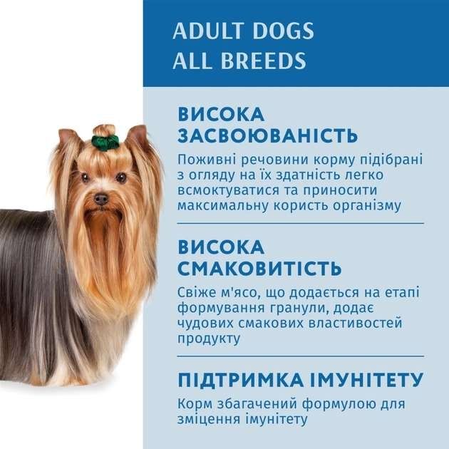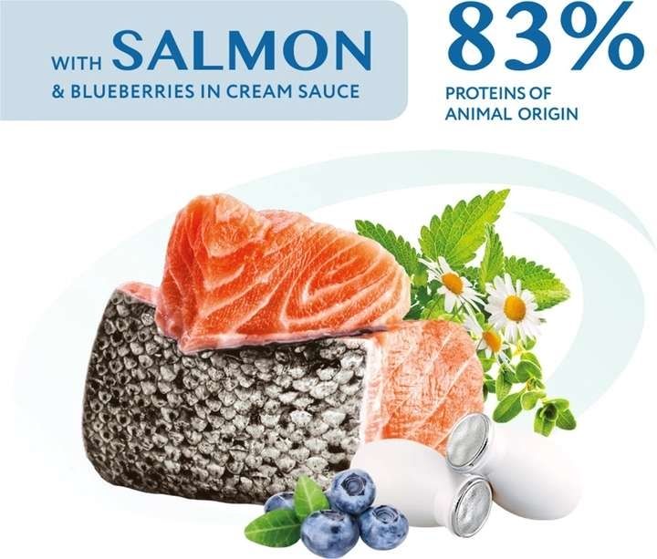Повнораціонний вологий корм у вигляді шматочків із лососем і лохиною у ніжному крем-соусі для дорослих собак всіх порід.Суперпреміум формула корму, яка виготовлена під контролем ветеринарів за технологією швейцарської компаніїSwiss Pet Nutrition Group, відмінно задовольняє потребу улюбленця в поживних речовинах і додатковій енергії. Раціон містить унікальний комплекс для підтримання та зміцнення імунітетуImmunity Support Mix, який складається зі спеціально очищених бета-глюканів, пребіотика нового покоління Actigen, ненасичених жирних кислот (Омега-3 та Омега-6), трав, ягід, цинку та біотину.Чому варто придбатиРозроблений з урахуванням щоденних потреб організму собаки у калоріях і нутрієнтах для підтримання здоровяМістить 81 протеїнів тваринного та рибного походження, зокрема лососевий протеїн, багатий амінокислотами, мінералами та корисними жирними кислотамиЛохина вирізняється високим вмістом вітамінів С та К, завдяки чому регулює кровотворну функцію та обмін речовин, посилює засвоєння кальцію, а також нормалізує роботу жовчного міхура та печінкиОмега-3 та Омега-6, цинк і біотин допомагають підтримувати здоровя шкіри та шерсті собаки, стимулюють їх регенерацію, зменшують ризик виникнення алергічних реакцій або запалень шкіриБета-глюкани покращують роботу імунної системи, а пребіотик нового покоління Actigen сприятливо впливає на здоровя травної системи та сприяє виведенню з організму патогенних бактерійЗавдяки наявності в складі кореня журавлини, лопуха, чорнобривців, квітів ромашки, кропиви та чебрецю, корм багатий на природні вітаміни, пребіотики та антиоксидантиПозитивно впливає на здоровя сечовидільної системи, адже має високий вміст очищеної водиПідходить для дорослих собак усіх порід як доповнення до сухого корму чи як повноцінний раціон