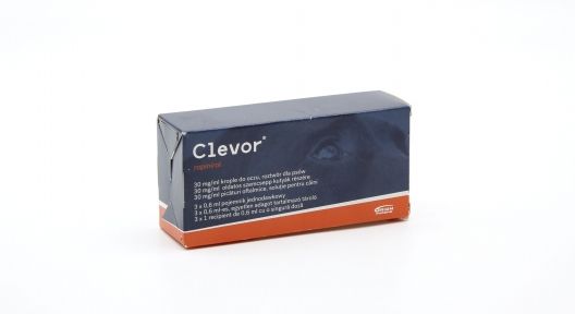 Очні краплі Клевор 30 мгмл, розчин в однодозовому контейнері для собакПерші блювотні краплі очні для собакскладКожен мл розчину містить:Репінірол (ropinirole) 30 мг (еквівалентно 34,2 мг гідрохлориду ропініролу)ЛІКОВА ФОРМА:Очні краплі, розчин у однодозовому контейнері. Прозорий розчин від блідо-жовтого до жовтого кольору. pH 3,8-4,5 та осмолярність 300-400 мОсмкг. 4.1Цільові види:собакаІнструкція із застосування із зазначенням цільового виду тварин. Викликання блювання у собак.ПРОТИПОКАЗАННЯ:Не застосовувати собакам із пригніченням центральної нервової системи, судомами чи іншими значними неврологічними дефіцитами, які можуть призвести до аспіраційної пневмонії.Не застосовувати собакам із гіпоксією, задишкою або без блювотного рефлексу.Не використовувати при попаданні гострих сторонніх предметів, агресивних хімічних речовин (кислот чи лугів), летких речовин чи органічних розчинників.Не застосовувати у випадках гіперчутливості до активної речовини або будь-якої з допоміжних речовин.Цей ветеринарний засіб не вимагає особливих температурних умов зберігання.Зберігайте контейнер для захисту від світла.Після відкриття пакетика контейнер слід зберігати у пакетику для захисту від світла.Розмір упаковки: 3 краплі по 0,6 мл для одноразового застосування