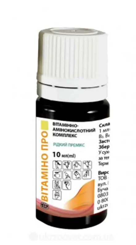 ВітАміно Про суміш кормових добавок (рідкий премікс), що містить комплекс гідрофільних вітамінів та амінокислот у рідкій формі для сільськогосподарської та декоративної птиці, свиней, коней, ВРХ, ДРХ, собак, котів та хутрових звірів.Речовини, що входять до складу ВітАміно Про, підтримують організм у період підвищених фізичних навантажень, у період росту та старіння, під час вагітності та лактації, при всіх видах стресу (температурний, харчовий, під час транспортування). Оптимальне поєднання амінокислот та вітамінів впливає на загальний тонус, поліпшує апетит, стан шерсті, шкіри та слизових оболонок. Премікс підвищує фертильність, запліднення та дозрівання плодів. ВітАміно Про також сприяє підвищенню резистентності до інфекційних та паразитарних агентів полегшує перебіг інфекційних хвороб, особливо за відсутності апетиту у тварини.Вітаміни, що входять у склад продукту, є каталізаторами обмінних процесів. Амінокислоти є структурними одиницями тканинних білків, ферментів, пептидних гормонів. ВітАміно Про максимально засвоюється організмом завдяки високій біодоступності не володіє сенсибілізуючою, ембріотоксичною, тератогенною та мутагенною дією.