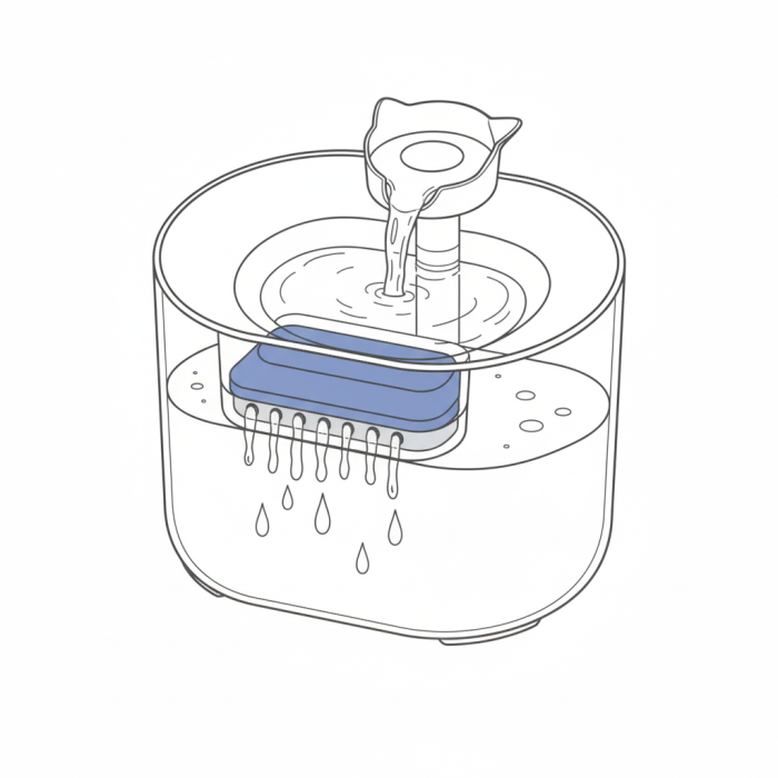Збагачений киснем потік води привертає увагу тварин, сприяючи регулярному питтю. Низький рівень шуму насосу (близько 35 дБ) забезпечує спокій домашнім вихованцям.