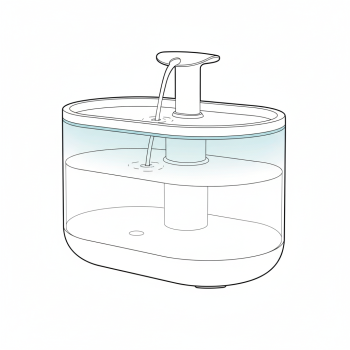 Ергономічний дизайн дозволяє легко доступати до піддону для води та піддону фільтра для доливання води та заміни фільтра. Всі деталі легко збираються та розбираються для очищення і заміни. Фонтан має ємність 2,1 л, видимий рівень води, безшумний робочий процес та поставляється з 1,5-метровим кабелем.