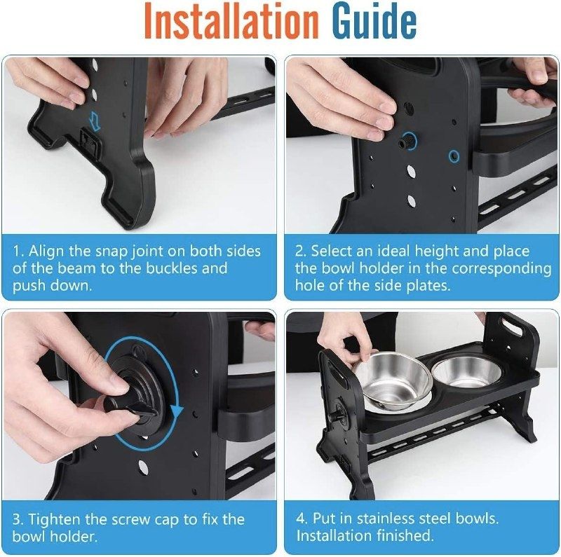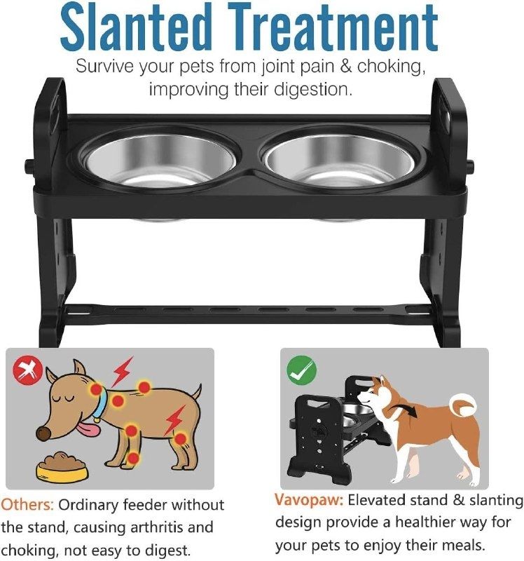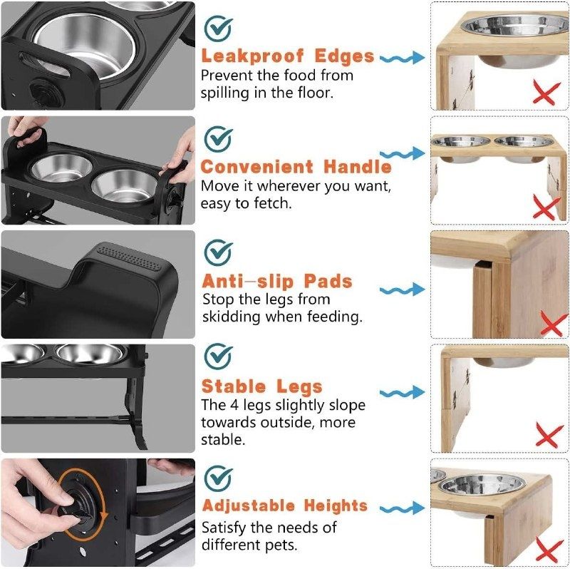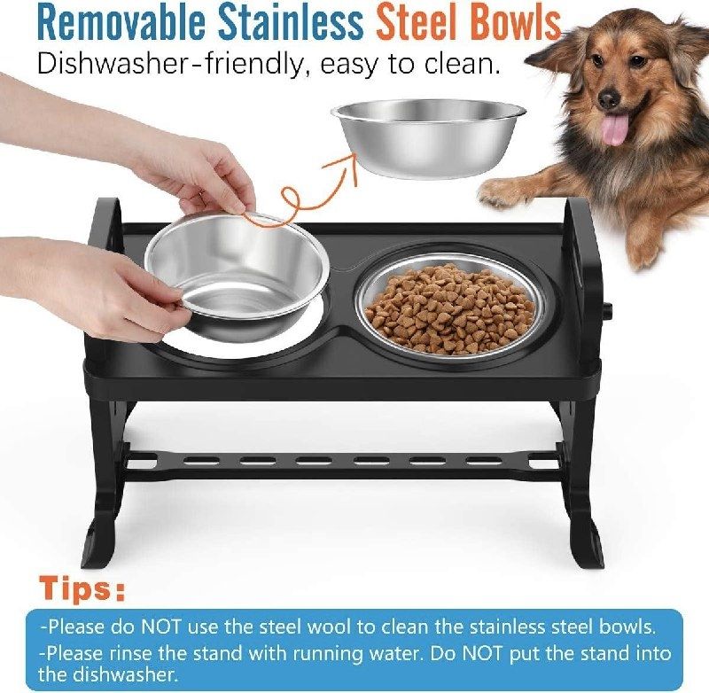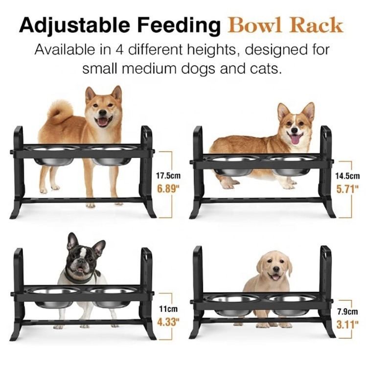 Регулюється на 4 висоти: доступні 4 різних висоти: 17,5 см 14,5 см 11 см 7,9 см.ви можете регулювати висоту відповідно до розміру вашого вихованця. Підходить для маленьких, середніх собак і кішок.2. Високоякісний матеріал: матеріал чаші з нержавіючої сталі, стійкі до іржі, довговічні. Подвійні миски можуть задовольнити потребу як в їжі, так і в воді. Доповнена зручною ручкою, підставка для чаш легко переміщається. Матеріал підставки-екологічний пластик.3. Не ковзає: протиковзкі вставки в нижній частині запобігають перевертання і ковзання стійки, коли ваші вихованці їдять.4. Завдяки регульованій підставці ці миски сприяють ефективному травленню і допомагають вашим улюбленим собакам або кішкам зменшити навантаження на шию і суглоби, викликану тривалим прийомом їжі з опущеною головою.5. Легко миється: миски можна мити в посудомийній машині або чистою водою.