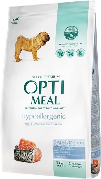 Це сухий раціон, розроблений спеціально для годування собак із харчовою непереносимістю та алергією на різні продукти.Ваш улюбленець полюбляє насичені та незвичайні смаки Спробуйтевологий корм Optimeal для собак, який містить лосось і лохину.Гіпоалергенний сухий корм Optimeal Adult Dogs Hypoallergenic з лососем для собак середніх і великих порідОдним із ключових інгредієнтів сухого корму Оптиміл для собак алергіків є лосось. Це чудове джерело білка і жирних кислот омега-3, які не тільки допомагають улюбленцям з алергією, а й сприятливо впливають на здоровя шкіри та шерсті.Преміум-раціон містить унікальну суміш інгредієнтів:Дикі травиЯгодиПребіотикиАнтиоксиданти.Рослинні компоненти є хорошими джерелами вуглеводів і харчових волокон, які не спричиняють алергічних реакцій. Склад містить спеціальну суміш вітамінів та мінералів, яка допомагає підтримувати здоровя імунної системи та забезпечує достатню кількість поживних речовин для підтримки здоровя загалом. Гіпоалергенний сухий корм Оптиміл із лососем для собак не містить штучних барвників, ароматизаторів та консервантів, що робить його безпечним та здоровим вибором для годування тварин з харчовою непереносимістю.Ветеринари залишають позитивні відгуки про цей продукт. Вони відзначають поліпшення стану шкірних покривів тварин. скористайтеся зручною таблицею годування та розрахуйте оптимальний розмір порції для свого чотирилапого друга.На сайті зібрані якісні та сертифіковані товари за доступними цінами. Ми пропонуємо своєчасну доставку по Києву та Україні. Купити гіпоалергенний сухий корм Optimeal з лососем для собак в інтернет-зоомагазині Petslike - це швидко та зручно.