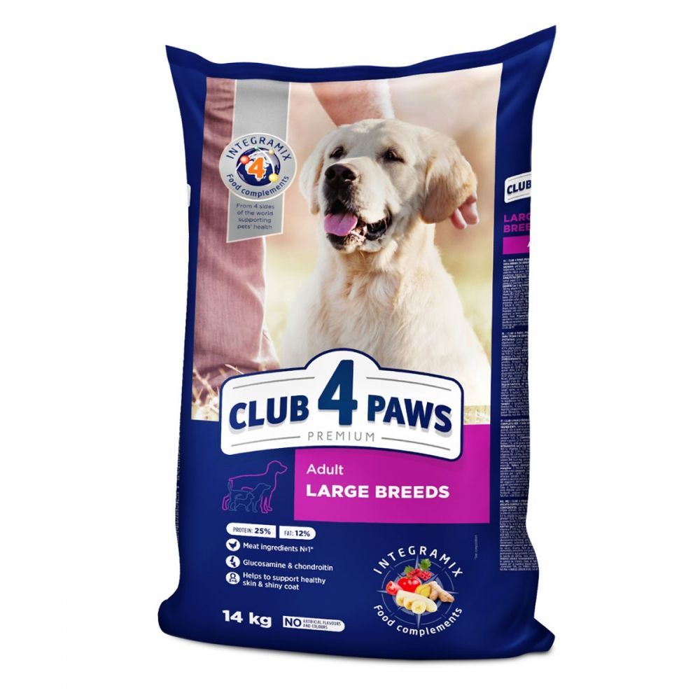 Сухий корм для собак великих порід Club 4 Paws Premium Adult large BreedsПовноцінний раціон Club 4 PAWS Premium Adult large Breeds розроблений з урахуванням фізіологічних потреб дорослих собак. Продукт збалансований за поживними і корисними речовинами, відповідає нормам годування вихованців великих порід.Склад корму:Формула продумана спеціально для собак старше 1 року і вагою від 26 кг до 90 кг.вміст сирого протеїну не менше 25. У складі повністю відсутні синтетичні барвники та підсилювачі смаку. Основні компоненти:тваринний білок: курказлаки: рис, кукурудза, ячміньжирклітковинаКорм містить корисні добавки, вітамінний комплекс, мінерали та мікроелементи, поліненасичені жирні кислоти, компоненти зі спеціальної розробки INTEGRAMIX. Піклуватися про фортеці кісток і суглобів допомагають хондропротектори: глюкозамін і хондроїтин.Ключові особливості Club 4 Paws Premium Adult Large BreedsВсі корми лінійки створюються за спеціальними рецептами з урахуванням особливостей харчування. Для улюбленців великих розмірів розроблена рецептура, що дозволяє забезпечити собаку всіма необхідними речовинами для здорового та активного життя. Достатня кількість протеїну тваринного походження забезпечує підтримку нормальної ваги, формування мязової маси, здоровя суглобів. Переваги корму:основний інгредієнт-мясоповноцінний раціон вихованцяспеціальна форма крокетунабір вітамінів, мінералів і антиоксидантів у складі.Продукт спрямований на підтримку здоровя вихованця і зручність власника. Високоякісний корм з правильним балансом білка, мінералів і вітамінів відмінний спосіб смачно і корисно нагодувати собаку.Рекомендації по годівліДля визначення обсягу порції береться до уваги вага і вік улюбленця, рівень активності, умови утримання. Рекомендується давати корм приблизно в один і той же час і дотримуватися норму годування. Обовязково контролюйте питний режим вихованця. При переході з іншого харчування корм слід додавати до основного поточного раціону поступово протягом 5 днів, спостерігаючи за самопочуттям і активністю тварини.