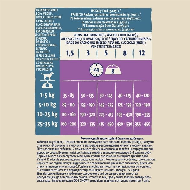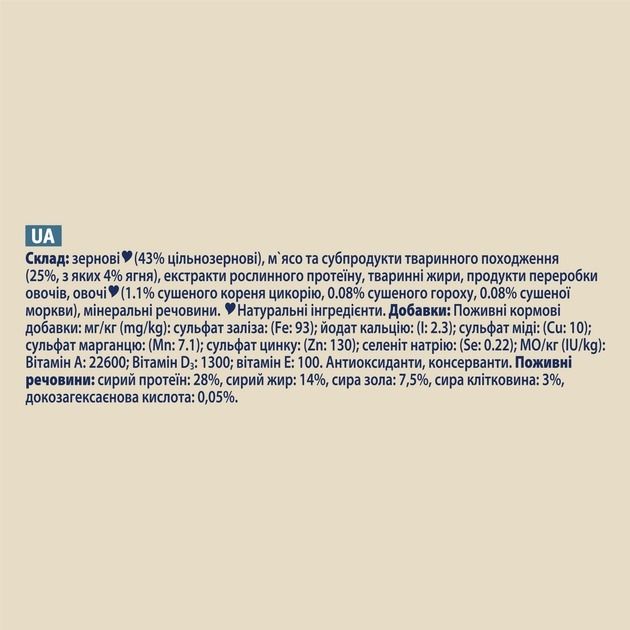Dog Chow (Дог Чау). З ягням. Сухий повнораціонний корм для цуценят віком до 1 року. Також підходить для вагітних та лактуючих собак.Як і ви, ми розуміємо, що собаки живуть більш щасливим та здоровим життям, коли вони можуть поводитися природно, жити на повну, досліджуючи навколишній світ Ось чому Purina, з нашим досвідом роботи в галузі харчування та дослідження поведінки собак, ще з 1926 року створили корм Dog Chow: харчування, розроблене з урахуванням потреб собак.Зростання є складною роботою для вашого цуценяти. Тому до складу сухого повнораціонного корму Dog Chow(Дог Чау) для цуценят входять антиоксиданти та докозагексаєнова кислота для підтримки природного захисту і здорового росту Вашого цуценяти. Корм також містить відібрані натуральні інгредієнти та цикорій, який має пребіотичні властивості для підтримки здорового травлення, щоб Ви були впевнені у тому, що Ваше цуценя готове день за днем досліджувати навколишній світ.Переваги цього корму для цуценят:100 повнораціонне та збалансоване харчуванняЗ відібраними натуральними інгредієнтами, без додавання штучних барвників та ароматизаторівЗ докозагексаєновою кислотою, яка відіграє важливу роль у здоровому розвитку цуценятиНеобхідні вітаміни та мінеральні речовини сприяють росту міцних зубів і кістокЦикорій завдяки своїм пребіотичним властивостям підтримує здоровя шлунково-кишкового трактуПодвійні форма і розмір гранул для уповільненного розгризання.Склад: зернові (43 цільнозернові), мясо та субпродукти тваринного походження (25,з яких 4 ягня), екстракти рослинного протеїну, тваринніжири, продукти переробки овочів, овочі (1.1 сушеного кореня цикорію, 0.08 сушеного гороху, 0.08 сушеної моркви), мінеральні речовини.Натуральні інгредієнти.Поживні кормові добавки: мгкг (mgkg): Сульфат заліза: (Fe: 93) Йодат кальцію: (I: 2.3) Сульфат міді: (Cu: 10) Сульфат марганцю: (Mn: 7.1) Сульфат цинку: (Zn: 130) Селеніт натрію: (Se: 0.22)МОкг (IUkg): Вітамін А: 22600 Вітамін D3: 1300 Вітамін Е: 100.Антиоксиданти, консерванти.Поживні речовини:сирий протеїн: 28,сирий жир: 14,сира зола: 7.5,сира клітковина: 3,докозагексаєнова кислота: 0.05.Рекомендації щодо годівлі(у грамах на добу):див. таблицю на упаковці. Перший стовпчик Очікувана вага дорослої тварини (кгkg), наступні стовпчики Вік цуценяти у місяцях та відповідна рекомендована кількість корму у грамах. При досягненні собакою 12-ти місячного віку рекомендовано перейти на харчування для дорослих собак. Цуценят у віці до 3 місяців годуйте зволоженим кормом 3 - 4 рази на добу. З тримісячного віку поступово зменшуйте ступінь зволоження та годуйте тричі на добу. У віці 6 - 12 місяців рекомендована дворазова годівля. Кожне цуценя особливе, тому кількість корму та час годівлі можуть відрізнятися в залежності від рівня його активності, фізичного стану та індивідуальних потреб. Годівля в період вагітності та лактації: протягом останніх 3 - 4 тижнів вагітності та в період лактації збільшуйте кількість корму в 1.5 - 2 рази. Для підтримки Вашого улюбленця у здоровому стані регулярно звертайтеся за консультацією до ветеринарних лікарів. Стежте за тим, щоб у вашої тварини завжди була свіжа вода. Включайте корм Dog Chow до раціону тварини поступово протягом 7 днів.Зберігатикормв сухому прохолодному місці.Дату Вжити до кінця, реєстраційний номер фабрики та номер партії: див. на зворотній стороні упаковки. Зберігати корм у сухом