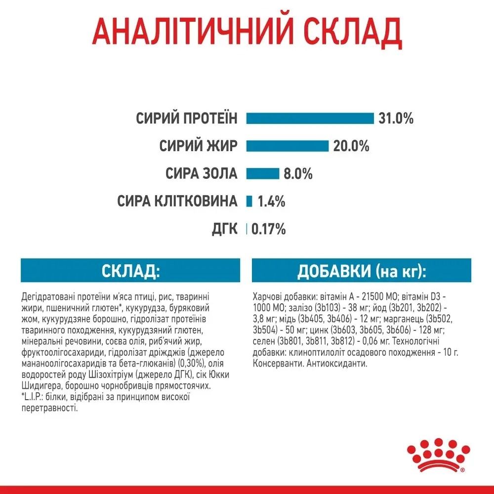 Корм Royal Canin для цуценят дрібних порід, з домашньою птицеюСухий корм для цуценят дрібних порід Royal Canin Mini Puppy - повнораціонний збалансований сухий корм для цуценят маленьких розмірів (вага дорослого собаки до 10 кг), віком від 2 до 10 місяців.Ріст - важливий етап в житті вашого собаки: це час великих змін, відкриттів і нових знайомств із навколишнім світом. Упродовж цього ключового періоду імунна система цуценяти поступово розвивається. Раціон Mini Puppy допомагає підтримувати систему природного захисту організму цуценяти зокрема завдяки комплексу антиоксидантів, що містить вітамін Е.Переваги:Комбінація нутрієнтів з високоперетравним білком (L.I.P.) та пребіотиками (ФОС) для підтримання здорового травлення та балансу кишкової флори, що сприяє оптимальній консистенції фекалій.Задовольняє енергетичні потреби цуценят собак малих розмірів в період росту та вгамовує апетит цуценят, вибагливих до корму.Склад:дегідратовані протеїни мяса птиці, рис, тваринні жири, ізолят рослинних протеїнів, кукурудза, буряковий жом, кукурудзяне борошно, гідролізат білків тваринного походження, кукурудзяний глютен, мінеральні речовини, рибячий жир, соєва олія, фруктоолігосахариди (0,34), гідролізат дріжджів (джерело мананоолігосахаридів), екстракти дріжджів (джерело бета-глюканів), екстракт чорнобривців прямостоячих(джерело лютеїну). L.I.P. - білки, відібрані за принципом оптимальної засвоюваності.Добавки (на 1 кг):харчові добавки: вітамін A -21 500 MO вітамін D3 - 1 000 MO вітамін E - 510 мг E1 (залізо) - 38 мг E2 (йод) - 3,8 мг E4 (мідь) -12 мг E5 (марганець) - 49 мг E6 (цинк) - 126 мг E8 (селен) -0,06 мг. Технологічні добавки: клиноптилоліт осадового походження: 10 г. Сенсорні добавки: екстракт Юки Шидигера -125 мг. Консерванти. Антиоксиданти.Аналітичні компоненти:сирий протеїн - 31 сирий жир - 20 сира зола - 7,7 сира клітковина - 1,4.Спосіб вживання:Дотримуватися рекомендованого дозування (див. таблицю на упаковці). Стежте за тим, аби у вашої тварини завжди була свіжа вода. Номер партії і дата закінчення строку придатності зазначені на упаковці. Зберігати в сухому прохолодному місці. Не вживати після закінчення строку придатності - може втратити споживчі властивості.