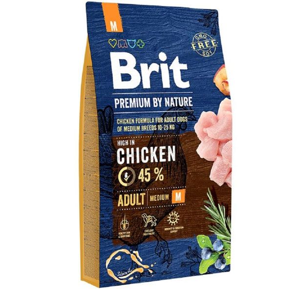 Brit Premium Adult M - сухий корм для дорослих собак середніх порід (від 10 до 25 кг).Переваги корми:Збалансована формула, повністю задовольняє потребу дорослих собак в поживних речовинах, вітамінах і минералахСодержит масло лосося - джерело Омега-3 і Омега-6 ненасичених жирних кислот, необхідних для підтримки здоровя шкіри і шерстиСодержит екстракт Юки Шідігера, благотворно впливає на процеси пищеваренияСодержит ФОС і МОС, необхідні для підтримання здоровя органів травлення та нормалізації иммунитетаСодержит всі необхідні микроеелементи в хелатній формі, завдяки чому забезпечується висока їх усвояемостьНе містить сої, яловичини і свинини - слабо засвоєні джерела протеїну, які призводять до низької засвоюваності корму і надмірного навантаження на кишковий тракт, крім того, вони можуть викликати алергічні реакцииНе містить ГМО (генетично модифіковані організми) - корми Brit повністю виробляються з інгредієнтів натурального походження.Составкорма:Борошно з мяса курки (41 ), кукурудза, пшениця, рис, курячий жир (консервований токоферолами), масло лосося, пивні дріжджі, натуральні ароматизатори, сушені яблука, мінеральні речовини, екстракт трав і фруктів (300 мгкг), мананоолигосахариди (150 мгкг), фруктоолігосахариди (100 мгкг), екстракт юки шідігери (80 мгкг), органічна Е4 мідь, органічний Е6 цинк, органічний селен.