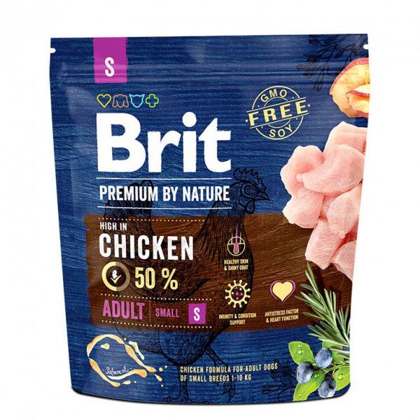 Повнораціонний корм для дорослих собак маленьких порід (1-10 кг)ЗМІСТ:борошно з мяса курки (41 ), кукурудза, пшениця, рис, курячий жир (консервований токоферолами), масло лосося, пивні дріжджі, натуральні ароматизатори, сушені яблука, мінеральні речовини, екстракт трав і фруктів (300 мгкг), мананоолигосахариди (150 мгкг), фруктоолігосахариди (100 мгкг), екстракт юки шідігери (80 мгкг), органічна Е4 мідь, органічний Е6 цинк, органічний селенАНАЛІТИЧНІ СКЛАДОВІ: сирий протеїн 27, сирої жир 16, волога 10, сира зола 6,5, сира клітковина-2,5, кальцій 1,4, фосфор 1,1ЕНЕРГЕТИЧНА ЦІННІСТЬ 4172 ккалкгХАРЧОВІ ДОБАВКИ: вітамін A 15000 МО, вітамін D3 1500 МО, вітамін е (альфатокоферол) 500 мг, E6 цинк 70 мг, E1 залізо 80 мг, E5 марганець 36 мг, E2 йод 0,65 мг, E4 мідь 20 мг, E8 селен 0,2 мгРекомендовані дозування Brit Premium Adult SВага собаки1кг3кг5кг7кг10кгДенна норма20г45г66г85г111г