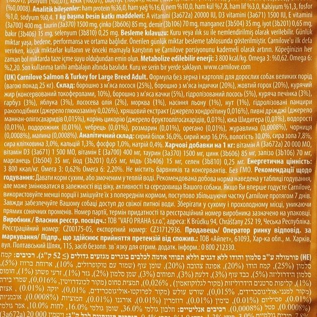 Сухий корм для дорослих собак великих порід Carnilove (Карнілав) SalmonTurkey Large Breedзабезпечує повнораційне харчування для вашого улюбленцяЧому варто купити:не містить зернових та картоплі, підходить для дорослих собак великих порід від 25 кгпозитивно впливає на розумовий розвиток, формування серцево-судинної системи та обмін речовинмясо лосося у складі покращує зовнішній вигляд шкіри та шерстіфрукти та трави у складі корму є чудовим джерелом вітамінів та мінералівсприяє зміцненню природного імунітетуЕнергетична цінність:3800 ккалкгВиробник:Carnilove, Чехія.