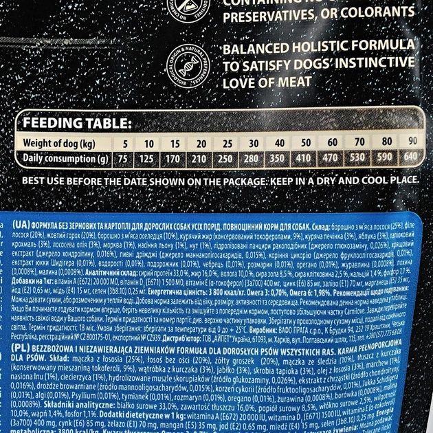 Carnilove Salmon Adult повнораціонний збалансований беззерновий сухий корм класу холістик для дорослих собак усіх порід.Склад: борошно з мяса лосося (25), філе лосося (20), жовтий горох (20), борошно з мяса оселедця (10), курячий жир (насичений токоферол, 9), куряча печінка (3), яблука (3), тапіоковий крохмаль (3), лососева олія (3), морква (1), насіння льону (1), нут (1), гідролізовані мушлі ракоподібних (джерело глюкозаміну, 0,026), хрящовий екстракт (джерело хондроїтину, 0,016), пивні дріжджі (джерело мананоолігосахаридів, 0,015), коріння цикорію (джерело фруклоолігосахаридів, 0,01), екстракт юки Шидигера (0,01), водорості (0,01), подорожник (0,01), чебрець (0,01), розмарин (0,01), орегано (0,01), журавлина (0,0008), лохина (0,0008), малина (0,0008).Енергетична цінність: 3800 ккалкг. Омега-3: 0.7, Омега-6: 1.98.