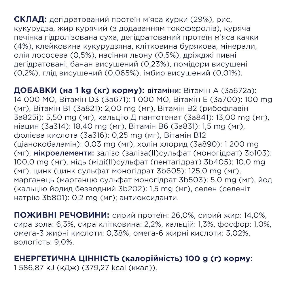 Склад: дегідратований протеїн мяса курки (29), рис, кукурудза, жир курячий (з додаванням токоферолів), куряча печінка гідролізована суха, дегідратований протеїн мяса качки (4), клейковина кукурудзяна, клітковина бурякова, мінерали, олія лососева (0,5), насіння льону (0,5), дріжджі пивні дегідратовані, банан висушений (0,23), помідори висушені (0,2), глід висушений (0,065), імбир висушений (0,01).Добавки (на 1 kg (кг)): вітаміни: Вітамін A (3a672a): 14 000 МО, Вітамін D3 (3a671): 1 000 МО, Вітамін E (3a700): 100 mg (мг), Вітамін B1 (3a821): 2,00 mg (мг), Вітамін B2 (рибофлавін 3a825i): 5,50 mg (мг), кальцію Д пантотенат (3a841): 13,00 mg (мг), ніацин (3a314): 18,40 mg (мг), Вітамін B6 (3a831): 1,5 mg (мг), фолієва кислота (3a316): 0,25 mg (мг), Вітамін B12 (ціанокобаламін): 0,03 mg (мг), холін хлорид (3a890): 1 200 mg (мг) мікроелементи: залізо (заліза(II)сульфат (моногідрат) 3b103): 100,0 mg (мг), мідь (міді(II)сульфат (пентагідрат) 3b405): 10,0 mg (мг), цинк (цинк сульфат моногідрат 3b605): 125,0 mg (мг), марганець (марганцю сульфат моногідрат 3b503): 5,0 mg (мг), йод (кальцію йодид безводний 3b202): 1,5 mg (мг), селен (селеніт натрію 3b801): 0,2 mg (мг) антиоксиданти.Поживні речовини: сирий протеїн: 26,0, сирий жир: 14,0, сира зола: 6,3, сира клітковина: 2,2, кальцій: 1,3, фосфор: 1,0, омега-3 жирні кислоти: 0,38, омега-6 жирні кислоти: 3,02, вологість: 9,0.