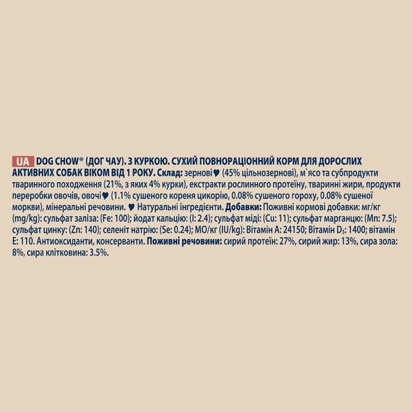 Сухий корм для собак з підвищеною активністю Dog Chow (Дог Чау) Active Adult 1+ містить необхідні незамінні амінокислоти і високий рівень антиоксидантів для підтримки здоровя мязів.Переваги:на 100 повнораціонне і збалансоване харчуваннянеобхідна кількість білків і жирів, які забезпечують організм поживними речовинами, щоб відновлювати запаси енергіїстворений для сильних мязів і для підтримки їхнього відновлення після напруженої активностізабезпечує підтримання нормальної ваги тіла, навіть у складні періоди тренуваньцикорій завдяки своїм пребіотичним властивостям підтримує здоровя шлунково-кишкового трактубез додавання штучних барвників та ароматизаторівспеціальна подвійна форма та розмір гранул