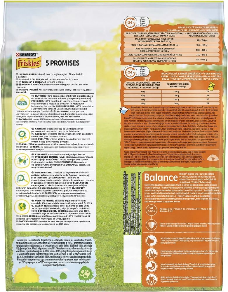 Сухий корм FRISKIES Balanceдлядорослих собак з куркою, яловичиною та овочами 2.4 кгСухий корм для собак FRISKIES Balance є джерелом високоякісного білку та усіх необхідних поживних речовин, яких потребує ваш собака, щоб жити щасливим і здоровим життям.В той день, коли у вашому домі зявився собака, ви з турботою почали піклуватися про нього, правильно годувати й допомагати жити щасливим і здоровим життям, приносити щоденну радість у ваш дім. Спираючись на багаторічний досвід та експертизу, FRISKIES протягом багатьох поколінь щоденно гарантує якісне та збалансоване харчування для щасливих та здорових собак.Ми піклуємось про вашого собаку і про вас, тому даємо 5 гарантій:Харчування: смачне 100 повнораціонне і збалансоване харчування, з використанням міксу тваринних та рослинних білківЯкість: ми проводимо сотні щоденних перевірок протягом нашого виробничого процесуЕкспертиза: розроблено спеціалістами з харчування тварин PurinaПрозорість: виготовлено з високоякісних інгредієнтів, ретельно відібраних у провідних та надійних постачальниківЗобовязання 2025 року: перейти на 100 використання упаковки, що підлягає вторинній переробці або повторному використанню до 2025 року.До того ж всі наші рецепти вже не містять штучних барвників.Переваги цього корму для собак.Без штучних барвниківМістить вітаміни A, D та ЕПідтримує природний імунітет вашого улюбленцяПідтримує здоровя шкіри та блискучість шерстіСприяє здоровому травленнюДопомагає підтримувати здоровя ясенСклад: зернові (цільні злаки 58), мясо та субпродукти тваринного походження (8, що еквівалентно 16 дегідратованого мяса та субпродуктів тваринного походження,з яких мін 4 курки), тваринні жири, екстракти рослинного протеїну, мінеральні речовини, овочі (0.6 дегідратованих овочів, що еквівалентно 4 овочів).Добавки: Поживні кормові добавки: МОкг(IUkg): вітамін А: 19000 вітамін D3: 1100 вітамін Е: 90 мгкг(mgkg): сульфат заліза: (Fe: 78) йодат кальцію: (I: 1.9) сульфат міді: (Cu: 8.7) сульфат марганцю: (Mn: 5.9) сульфат цинку: (Zn:110) селеніт натрію: (Se: 0.19) вітаміни групи В: 75.Барвники, консервант та антиоксиданти.Без штучних барвників.Поживні речовини: сирий протеїн: 20, сирий жир: 10, сира зола: 8, сира клітковина: 3.5, Омега-6 жирна кислота: лінолева кислота: 1.7, Омега-3 жирна кислота: ліноленова кислота: 0.1.Рекомендації щодо годівлі (грамдобу):Вага тварини кгkg: Кількість корму гgДУЖЕ МАЛИЙ 15 кгkg: 40120 гgМАЛИЙ 510 кгkg: 120190 гgСЕРЕДНІЙ 1025 кгkg: 190350 гgВЕЛИКИЙ 2545 кгkg: 350515 гgДУЖЕ ВЕЛИКИЙ 4570 кгkg: 515695 гgКількість корму розрахована для помірно активних собак за нормальної температури оточуючого середовища. Добова норма може змінюватись в залежності від індивідуальних потреб собаки та має бути адаптована таким чином, щоб зберегти його струнку та здорову статуру. Свіжа чиста питна вода повинна бути доступною тварині в будь-який час.Рекомендації щодо зберігання.Зберігати сухий корм для собак у сухому прохолодному місці. Дату Вжити до кінця, реєстраційний номер фабрики та номер партії: дивіться на упаковці.Iмпортерпідприємство, що приймає претензії та запитання споживачів: ТОВ Нестле Україна, 03150, Україна, м. Київ, вул. Велика Васильківська, б. 139.