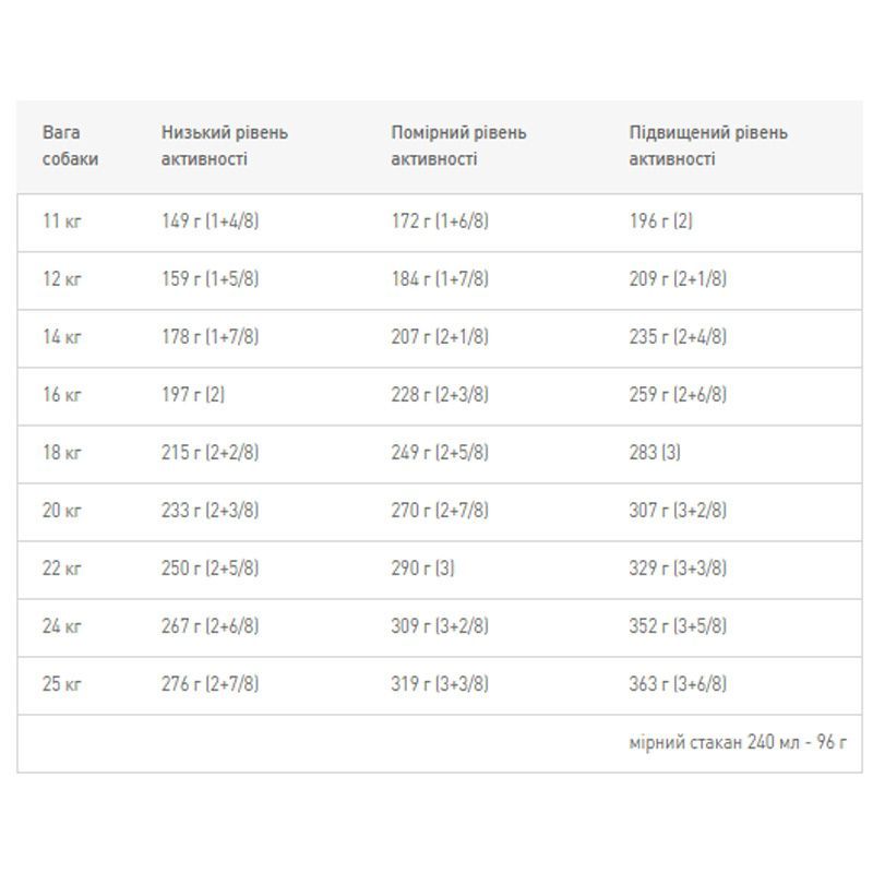 Помогает укреплять природние защитние механизми взрослих собак средних пород в возрасте от 12 месяцев до 7 летСпособствует укреплению природних механизмов защити организма собаки благодаря манноолигосахаридам, гарантирующим баланс кишечной микрофлори, жирним кислотам Омега 3 (ЕРА и DHA) и Омега 6, цинку, витамину А и биотину для регенерации шерсти и кожи. Кроме того, продукт содержит витамини Е и С, помогающие поддерживать жизнеспособность клеток.Підтримує оптимальний вагу завдяки збалансованій енергоємності (вміст жирів: 14, виміряна обмінна енергія: 3930 ккалкг).Гарантує оптимальну роботу травлення завдяки збалансованому вмісту високоякісних білків і харчових волокон, що регулюють роботу пищеварительного тракту.Задовольняє апетит самих вибагливих собак завдяки ретельно відібраним натуральних ароматів, спеціально розробленим текстурою, формою і розміром кроціт і сучасній упаковці, що зберігає свіжість і аромат продуктуРекомендований добовий раціон, в грамахВага собакиВідсутність фізичної активностіФізична активність 1 години в деньФізична активність 1 години в день12 кг180 200 220 14 кг205 225 250 16 кг225 250 275 18 кг245 270 300 20 кг265 295 325 22 кг285 315 345 24 кг300 335 370 25 кг310 345 380Інгредієнти кукурудза, кукурудзяна мука, дегідратованого мясо птиці, тваринні жири, печінка птиці, буряковий жом, дріжджі, рослинна олія, рибячий жир, мінеральні речовини, мікроелементи, гідролізат дріжджів (джерело манноолигосахаридов), яєчний порошок, вітаміни. Поживні речовиниКількістьБілки ()25Жири ()14- Лінолева кислота ()2,6- Арахідонова кислота ()0,07- Омега 6 ()2,6- Омега 3 ()0,6- EPA + DHA ()0,3Пищевие волокна ()6,5Зола ()5,7Безазотистие екстрактивние вещества ()45,9- Крахмал ()40,8Минеральние веществаКоличествоКальций ()1,1Фосфор ()0,8Натрий ()0,36Калий ()0,6Магний ()0,09Медь (мгкг)23Железо (мгкг)170Марганец (мгкг)81Цинк (мгкг)240Селен ()0,2Йод ()3,5ВитаминиКоличествоВитамин А (МЕкг)15 000 Витамин D3 (МЕкг)600Витамин Е (мгкг)500Витамин С (мгкг)200Витамин В1 (тиамин) (мгкг)5Витамин В2 (рибофлавин) (мгкг)3Кальция пантотенат (мгкг)17Витамин В6 (пиридоксин) (мгкг)5,6Витамин В12 (цианокобаламин) (мгкг)0,05Ниацин (мгкг)11Биотин (мгкг)0,7Фолиевая кислота (мгкг)0,6Холин (мгкг)1500Другие веществаКоличествоТаурин ()0,1Обменная енергияккалкгРассчитанная по формуле Atwater NRC 744096Рассчитанная по формуле Atwater NRC 853707Виміряна в Науково-дослідному центрі Royal Canin3930Виробник ФранціяПольща