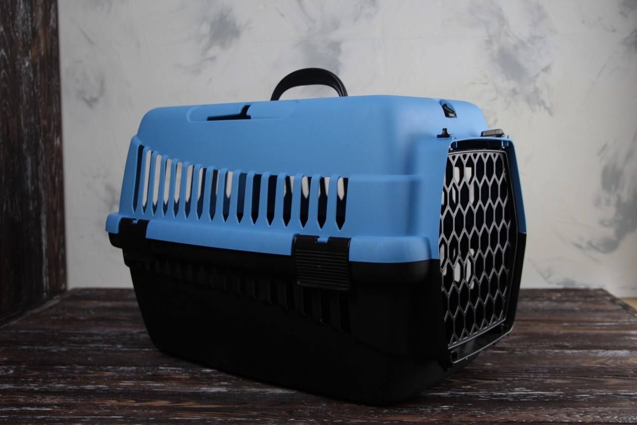 Переноска для тварин блакитно-чорна пластик 55х39х36 см до 8 кг