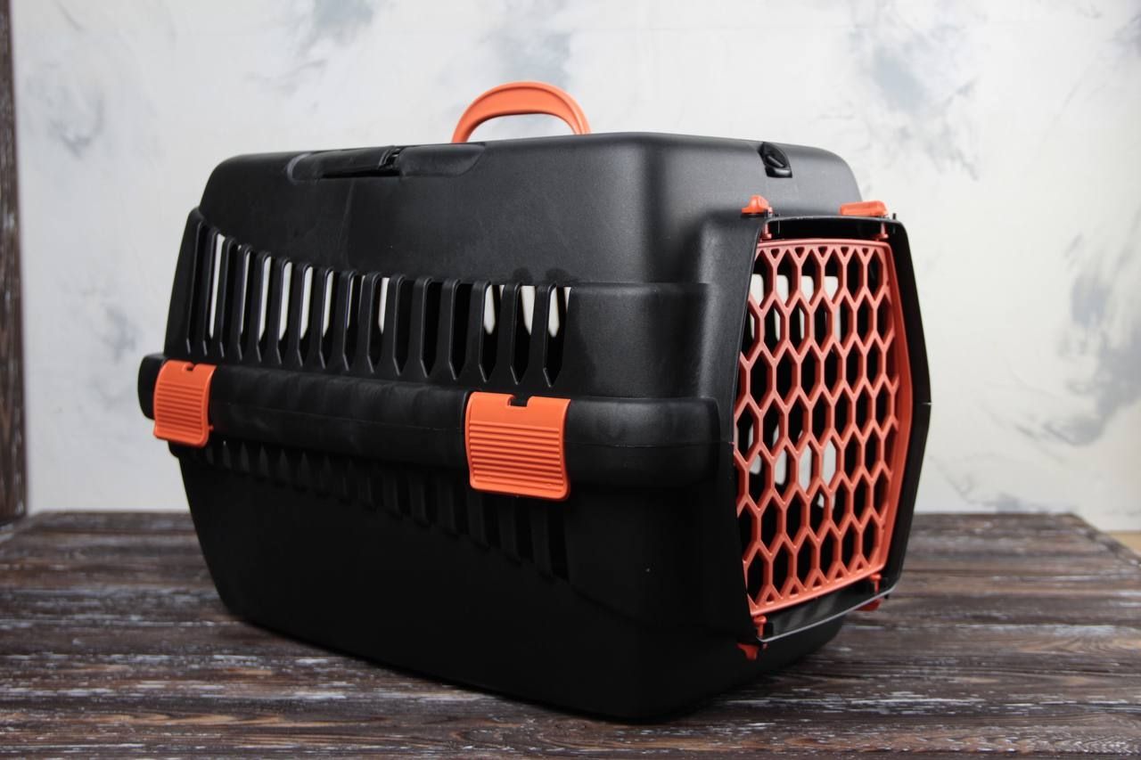 Переноска для тварин чорна пластик помаранчеві двері 55х39х36 см до 8 кг
