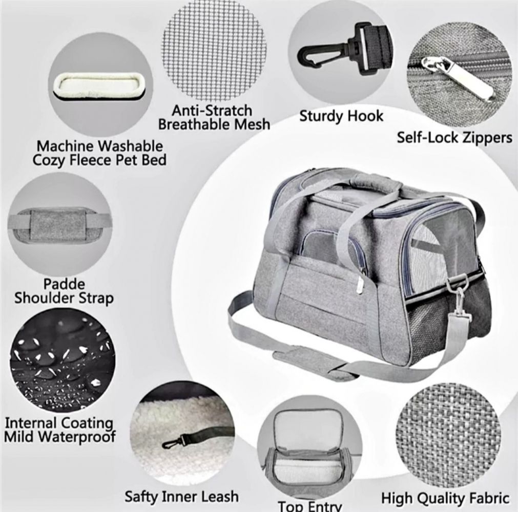 Переноска-сумка для тварин. Довжина плечового ременя регулюється.Матеріал перенесення-Тканина Оксфорд. Матеріал подушки-шерсть. Розмір в зібраному стані - 442825Сумку для собак в літакбажано використовувати для прогулянок і короткочасних подорожей, для тривалих подорожей краще використовувати пластикову переноскуЩоб убезпечити тварину від випадкового вистрибування з сумки, пристебніть короткий повідець, яким оснащена сумка, до нашийника або шлеї вихованцяПеред прогулянкою або подорожжю уважно перевірте всі замки в перенесенні, щоб уникнути вистрибування тварини вони повинні бути добре застебнутіВідрізняється функціональністю і стриманим дизайном