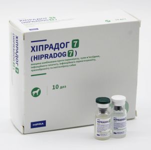 ОписОднодозова вакцина (1 ml) для собак від 8 тижнів.Склад однієї дози (1 ml)Ліофілізований компонент:Живий атенуйований парвовірус собак, штам C-780916 10 TCID50Живий атенуйований вірус чуми собак, штам Lederle 10 TCID50Живий атенуйований аденовірус типу 2, штам Manhattan 10 TCID50Живий атенуйований вірус собачого парагрипу, штам Penn 10370 10 TCID50Рідкий компонент:Інактивована Leptospira interrogans серовар icterohaemorrhagiae 10 мікроорганізмівІнактивована Leptospira interrogans серовар canicola 10 мікроорганізмівФармацевтична формаЛіофілізат та розчин для підшкірного введення.Імунобіологічні властивостіВакцина забезпечує імунітет проти парвовірусу собак, чуми собак, аденовірусів 1 та 2 типів, парагрипу та лептоспірозу. Використовуються атенуйовані віруси та інактивовані бактерії.Вид тваринСобаки з 8 тижнів.Показання до застосуванняПрофілактика парвовірусу собак, чуми собак, інфекційного гепатиту, інфекційного ларинготрахеїту, трахеобронхіту та лептоспірозу (серовари icterohaemorrhagiae та canicola).Застереження при застосуванніВикористовувати стерильні шприци та голки, вакцину застосовувати одразу після розчинення. Вакцинувати тільки здорових та дегельмінтизованих тварин.Взаємодія з іншими засобамиНе встановлено.Особливі вказівки при вагітностіНе застосовувати вагітним тваринам.Дозування та спосіб застосування1 ml підшкірно одній тварині з 8 тижнів.Рекомендована програма вакцинації:Перша доза 8 тижнів, повтор 12 тижнів.Ревакцинація щорічно однією дозою.Первинна вакцинація невакцинованих раніше тварин дві дози з інтервалом 34 тижні.Побічні ефектиМожлива поодинока гіперчутливість при необхідності вводять антигістамінні препарати.Період виведення (каренції)Відсутній.Заходи безпеки для персоналуДотримуватись асептики та правил гігієни. У разі випадкової самоінєкції звернутися до лікаря.Утилізація невикористаної вакциниВідповідно до чинного законодавства.Термін придатності18 місяців. Використати одразу після розчинення.Умови зберігання та транспортуванняТемпература 28 C, захищати від світла, не заморожувати.