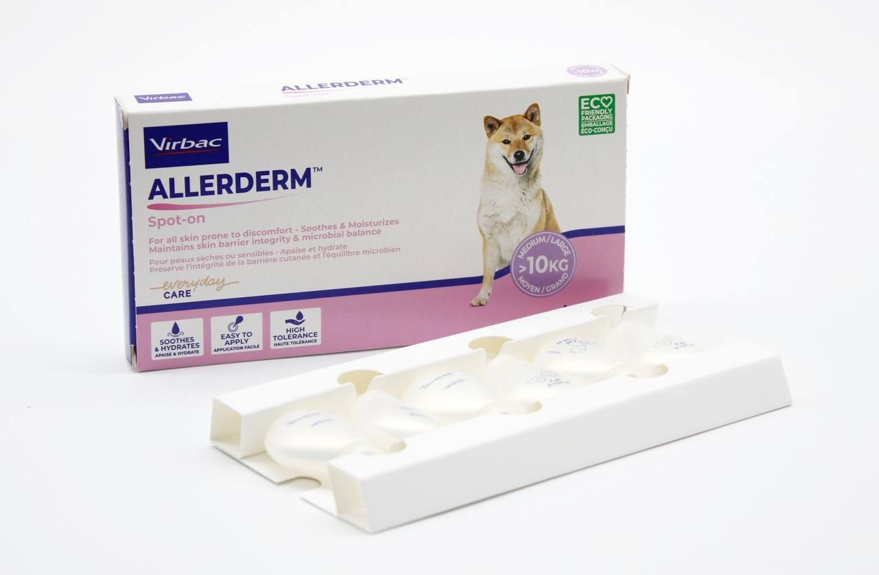 Allerderm Spot-onПродукт для зовнішнього застосування особливо рекомендований для тварин з дерматологічними проблемами, але може використовуватися для поліпшення загального стану шкіри та вовни тварини.Склад:Кераміди, холестерол, натрію лауроїл лактитат, ксантанова камедь, вода.Форма випуску: На вигляд є прозорою рідиною зі слабким специфічним запахом.Випускають препарат у пластикових тюбик-піпетках по 2 мл або 4 мл.Тюбик-піпетки одного обєму по 6 штук упаковані в картонні коробки в наступних дозах: Упаковка 6 піпеток по 2 мл - для котів та собак до 10 кгУпаковка 6 піпеток по 4 мл - для собак 10-20 кгПоказання до застосування:Алердерм Спот-он рекомендується як додатковий засіб при лікуванні дерматозів у тварин з поверхневими пошкодженнями шкіри.Аллердерм Спот-он допомагає відновити захисний барєр шкіри, зволожуючи її, знижуючи чутливість та посилюючи її захисні функції.Спосіб застосування та дозування:Препарат наноситься крапельно на суху чисту шкіру.Перед використанням кінчик піпетки відламують, повертають його, одночасно утримуючи піпетку у вертикальному положенні.Розсунувши шерсть, наносять Аллердерм Спот-он на шкіру, рівномірно розподіляючи весь вміст піпетки по спині тварини.Для собак: починаючи з холки.Для котів: починаючи з шиї.Обробка проводиться 1 раз на тиждень (1 піпетка).Курс 4 тижні.При необхідності доза може бути збільшена (від двох до трьох піпеток на тиждень, по одній на день), залежно від стану шкіри та відповідно до рекомендації ветеринарного лікаря.Для підтримки здорового стану шкіри та вовни застосовують одну піпетку на місяць.Умови зберігання: Зберігати в упаковці виробника в сухому, захищеному від прямого сонячного проміння місці, при температурі від +5С до +25С.