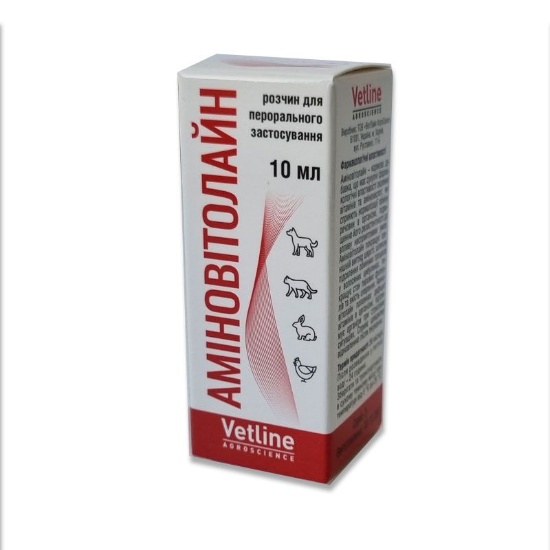 ЯКІСНИЙ І КІЛЬКІСНИЙ СКЛАД1,0 мл кормової добавки містить діючі речовини:вітамін А - 2500 МОвітамін В1 - 1,2 мгвітамін В2 - 4,5 мгвітамін В6 - 2,5 мгвітамін В12 - 0,01 мгвітамін С -30,0 мгвітамін D3 - 2250 МОвітамін Е - 10 МОвітамін К3 - 4,5 мгфолієва кислота - 0,25 мгпантотенова кислота - 9,0 мгбіотин - 0,05 мгнікотинамід - 22,0 мгхоліну хлорид - 50,0 мгметіонін - 10,0 мгаргінін - 10,0 мглейцин - 12,0 мгтреонін - 2,0 мгтриптофан - 6,0 мглізин - 50,0 мгвалін - 22,0 мгізолейцин - 8,0 мгфенілаланін 10,0 мггістидин 6,0 мг.ВИДИ ТВАРИНСобаки, коти.ПОКАЗАННЯ ДО ЗАСТОСУВАННЯАміновітолайн кормова добавка, що має сукупні фармакологічні властивості окремих вітамінів та амінокислот, які сприяють нормалізації обміну речовин в організмі, підвищенню його резистентності до впливу несприятливих умов.Аміновітолайн покращує зовнішній вигляд шерсті, шляхом підсилення обмінних процесів у волосяних цибулинах. Препарат покращує стан перових фолікулів та якість оперення.Аміновіолайн поповнює дефіцит вітамінів в організмі, підтримує організм за стресових ситуацій. Сприяє швидкому відновленню після лікування.Виробник:Vetline Agroscience, Україна