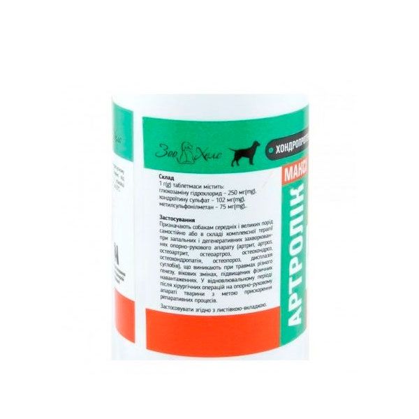 Артролик Максі ЗооХелс, 100 табОписПлоскі циліндричні пігулки з насічкою без оболонки кремового кольору з коричневими вкрапленнями зі специфічним запахом.Випускається Зоохелс Артролик у двох модифікаціях: Зоохелс АРТРОЛІК (для дрібних порід собак та котів, таблетки по 0,5 г) та Зоохелс Артролик максі (для середніх та великих порід собак, таблетки по 2 г).склад1 г таблетки містить:глюкозаміну гідрохлорид - 250 мг,хондроїтину сульфат - 102 мг,метилсульфонілметан 75 мг.Допоміжні речовини: мікроцелюлоза, полівінілпіролідон, пивні дріжджі, тальк, марганцю сульфат, стеарат кальцію, вітамін С.Фармакологічні властивостіЗоохелс Артролик є комплексом біологічно активних речовин: глюкозаміну гідрохлорид, хондроїтину сульфату і метилсульфонілметан, які знаходяться в легкозасвоюваній і доступній для організму формі.Глюкозамін і хондроїтин сульфат, як природні компоненти сполучної тканини, мають протизапальну, десенсибілізуючу та хондропротекторну дію на кістково-хрящову систему суглоба.Додаткове надходження хондроїтину та глюкозаміну особливо необхідне тваринам у період відновлення після травм та оперативних втручань, при тяжких фізичних навантаженнях у службових та спортивних собак.У собак, які зазнають систематичних навантажень на суглоби, особливо з віком відбувається зменшення кількості суглобової рідини, зниження еластичності звязкового апарату та дегенеративні процеси в хрящі.Глюкозамін та хондроїтин сульфат знижують ступінь вираженості та інтенсивність прояву дегенеративних змін у суглобі, зменшують ймовірність розвитку захворювань опорно-рухового апарату тварини.Глюкозамін збільшує вміст глюкозаміногліканів у суглобі, які у свою чергу є будівельними блоками при відновленні хрящової тканини.Глюкозамін стимулює синтез колагену, виявляє антиоксидантну дію, пригнічує активність лізосомальних ферментів (які руйнують хрящ), зменшує прояви побічних реакцій на хіміотерапевтичні засоби захисту тварин при застосуванні в комплексі лікувально-профілактичних заходів разом із нестероїдними та стероїдними.Стимулює регенерацію хрящової тканини.Глюкозамін та хондроїтин сульфат беруть участь у синтезі сполучної тканини,сприяючи запобіганню процесам руйнування хряща та стимулюючи регенерацію тканини.Введення екзогенного глюкозаміну посилює вироблення хрящового матриксу та забезпечує неспецифічний захист від хімічного пошкодження хряща.Глюкозамін у вигляді сірчаної солі є попередником гексозаміну, а сульфат-аніон необхідний для синтезу глікозаміногліканів.Іншою можливою функцією глюкозаміну є захист пошкодженого хряща від метаболічного руйнування, що викликається НПЗП та кортикостероїдами, а також власна помірна протизапальна дія.Хондроїтин сульфат незалежно від того, всмоктується він в інтактній формі або у вигляді окремих компонентів, служить додатковим субстратом для утворення здорового хрящового матриксу.Стимулює утворення гіалуронону, синтез протеогліканів та колагену типу II,а також захищає гіалуронон від ферментативного розщеплення (шляхом придушення активності гіалуронідази) та від ушкоджуючої дії вільних радикалівпідтримує вязкість синовіальної рідини, стимулює механізми відновлення хряща та пригнічує активність тих ферментів, які розщеплюють хрящ (еластаза, гіалуронідаза).При лікуван