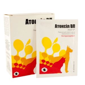Атоксіл ВПЛегкий аморфний порошок білого кольору без смаку і запаху для перорального застосування. Розфасований в пакетиках-саше і упакований в картонну коробку по 10 пакетиків.Склад: 100 г препарату містить: Діоксид кремнію колоїдний - 100 гр.Применение: Препарат применяют в качестве профилактики а так же в комплексе терапевтических мероприятий как сорбент для перорального применения: собакам, кошкам при желудочно-кишечних заболеваниях с диарейним синдромом, гепатитах, интоксикациях, микотоксикозахСпособ применения и дозировка: Применяется животним перорально (внутрь) в форме порошка добавляется в корм путем ступенчатого смешивания.Суточная доза препарата, грамм на 1 кг масси тела Кошки, собаки 0,1 - 0,2 гр Суточную норму делят на 3-4 приема.Протипоказання:Атоксіл не призначається при: гіперчутливості до компонентів препарату виразкової хвороби шлунка наявності ерозій і виразок на стінках кишечника кишкової непрохідності у гострій фазі.