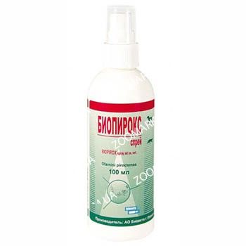 СкладOlamini piroctonas 1,0 г, Polyoxyetylene lauryl алкоголь, пропіленгліколь, гліцерин 85, Dimethicon copolyol, спирт легкий денатурований, 1 медичний бензин, дистильована вода.Форма випускуПрепарат випускають у скляних або пластмасових балонах по 100 мл з механічним розпилювачем.Фармакологічні властивостіАнтибактеріальну та антимікотичну дію надає зєднання пироктоноламин (октопирокс). Серосодержащие речовина впливає на дерматофітів роду Trichophyton і Microsporum, а також T. mentagrophytes, T. rubrum, T. verrucosum, M. canis, M. gypseum. Биопирокс порушує метаболізм грибів, справляє бактерицидну дію на Escherichia coli, Salmonella spp., Klebsiella spp., Enterobacteriacea spp. і Pseudomonas aeruginosa. Завдяки наявності допоміжних компонентів, препарат утворює на шкірі захисну плівку, зволожує її.СвідченняБиопирокс застосовується для лікування мікроспорії та трихофітії у собак, кішок та інших хутрових звірів.Дози і спосіб застосуванняДля еффективного использования препарата, необходимо удалить загрязнения и шерсть животного в пораженной зоне и вокруг нее. Перед применением флакон с лекарством тщательно встряхнуть. Распиление происходит в течение 2-3 секунд. Расстояние до пораженного участка кожи составляет 10-20 сантиметров. Обрабативать поверхность необходимо 4 раза в день с промежутком 2-4 дня. Если виздоровление не наступило, то курс лечения нужно повторить. Сроки курса назначаются ветеринаром, они зависят от бистроти затягивания ран, а также от тяжести повреждения кожи. Не можна допускати, що при обробці тварини поруч знаходилося відкрите полумя або нагрівальні прилади. Рекомендується наносити препарат на відкритому просторі, або приміщення повинно володіти хорошою вентиляцією. Необхідно запобігти злизування препарату, для цього щелепи тварини фіксуються з допомогою намордника, тасьми або спеціального шийного коміра. Не допускати потрапляння в очі. Якщо уражено більше 25, то препарат наноситься в два етапи, спочатку на одну, потім на іншу половину тіла.Побочние действияВозможность возникновения аллергических реакций у особенно чувствительних животних. Передозировка препарата в 10 раз визивает покраснение кожи и випадение шерсти на обрабативаемом участке. Эти явления исчезают через 5-7 дней, не требуя лечения.ПротивопоказанияНе допускается применение препарата продуктивним животним.Условия храненияПрепарат является горючим веществом 2 степени. Хранить в закритой упаковке производителя, отдельно от кормов и пищевих продуктов, в сухом, защищенном от света, недоступном для детей месте при температуре 15- 25С. Срок годности 24 месяца.ВиробникБіовета (Bioveta), Чехія.