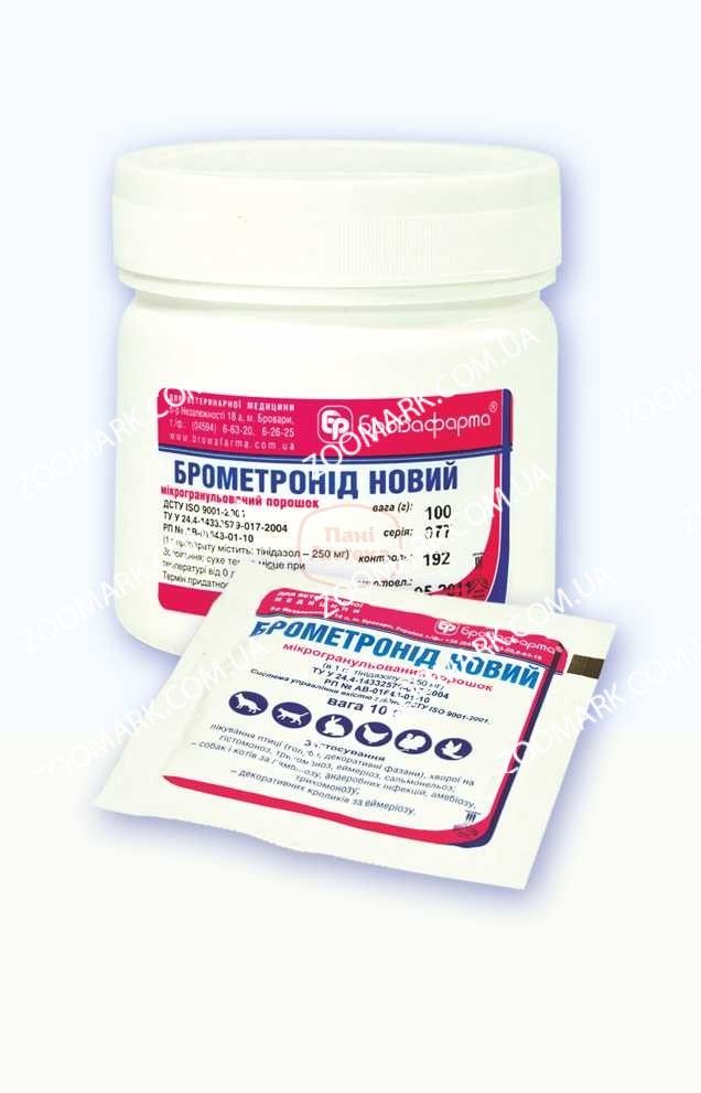 ОписМикрогранулированний порошок світло-жовтого кольору, важко розчинний у воді.Фармакологічні властивостіТинідазол синтетичний препарат з широким спектром дії: щодо найпростіших (Balantidium coli, Entamoeba hystolytica, Treponema hyodysenterie, Histomonas meleagridis, Lamblia intestinalis, Eimeria spp., Trichomonas columbae, T. gallinae) бактерицидної дії на анаероби (Bacteroides, Fusobacterium, Clostridium, Eubacter) більшості видів грампозитивних і грамнегативних коків і т. п.Склад1 г препарату містить: тинідазол 250 мг і нейтральний носійСвідченняЛікування і профілактика при: амебної дизентерії, балантидиозе, колибактериозе, сальмонельозі, еймериозах, ентеритах невизначеної етіології, септицемії, післяпологових та хірургічних інфекцій свиней трихомоноз, еймериозе, сальмонельозі, хірургічних і післяпологових ускладненнях у великої рогатої худоби гистомонозе (тифлогепатите), трихомоноз, еймериозах, сальмонельозі птахів (кури, куріпки, перепілки, голуби, індики, фазани) еймериозе (кокцидіоз печінки) у кроликів і нутрій.Дози і спосіб застосування.Поросятам-молочникам по 0,25 г, а подсвинкам по 0,5 г на животное 2 раза в сутки с кормом в течение 3-4 суток. После лечения дизентерии на 7-10-е сутки целесообразно повторить обработку етим препаратом или другими антимикробними средствами (Бровасептол, Бровамулин или др.) в профилактических дозах согласно имеющмся наставлениям. Телята 5-7 г с кормом, через каждие 12 часов, в течение 3-х суток. Кролики и нутрии терапевтически - ежесуточно по 0,2-0,3 г кг масси тела с кормом, 3-е суток подряд молодняку, во время отъема от маток (профилактически) по 0,1 г кг масси тела в течение 10 суток. Птици терапевтически по 2 г кг корма в течение 10 суток, а затем такое же время профилактически в дозе 1 г кг корма.ПротивопоказанияНе применять курам-несушкам.ПредостереженияОтдельние животние могут иметь повишенную чувствительность к тинидазолу с появлением аллергической реакции в виде лихорадки, крапивници, рвоти. После прекращения дачи препарата ети признаки исчезают без специального вмешательства. Убой животних разрешается через 7 суток после последнего введения препарата.Форма випускуФлакони з жовтогарячого скла або полімерів по 20, 100 г і пакети по 400 г і 1 кг.ЗберіганняУ сухому затемненому місці при температурі від 0 до 20С.Термін придатності. 3 роки.Як купити Брометронид новийОформити замовлення через корзинуОформити замовлення по контактним телефонам