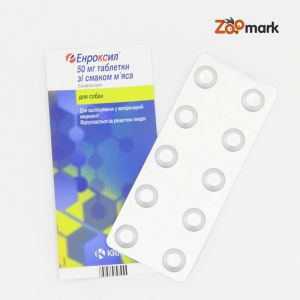 Опис Энроксила в таблеткахЭнроксил антибактеріальний препарат широкого дії для лікування інфекцій травних, дихальних, сечостатевих органів у тварин.Форма випуску. Світло-жовті таблетки з вмістом 1550150мгенрофлоксацина. Таблетки мають яскраво виражені мясний смак, тому кішки і собаки приймають їх із задоволенням. Допоміжними речовинами є,манітол, кукурудзяний крохмаль, колоїдний діоксид кремнію. ФармакологияЭнрофлоксацинв таблетках вбиває мікроорганізми таких неприємних захворювань, як кишечнаясинегнойнаягемофильнаяпалочки, сальмонельоз,бордетеллабруцелла, стрепто-, стафілококи,лістерії,коринебактерії,протей, клостридії, мікоплазми,актинобациллярнаяинфекция.Чинне веществоенрофлоксацинугнетает активностьгирази, ферменту, який бере участь у реплікації ДНК в бактеріальному ядрі.Энроксилхарактеризуется добрим всмоктуванням і швидким рознесенням по всьому організму. Якщо у вихованця виявлена інфекція, слід Энроксилкупить і дати його негайно, тоді буквально через 1,52 години організм почне пручатися хвороби. Дія препарату дорівнює 24 годинам. Висновок його відбувається з жовчю та сечею.Інструкція по применениюПоказан для кішок, собак при інфекціях органів травлення, дихання та органів сечостатевої системи, коли гостро запалені мякі тканини, при отиті, а також, якщо інфіковані рани мікроорганізмами, чутливими кенрофлоксацину. Детальна інструкція містить усі необхідні дані і вказівки.Энроксилможно придбати у трьох дозуваннях, для кожного існує свій розрахунок.Энроксил15 мг:Кішкам, собакам - 1таб. на 3кг ваги дають з кормом двічі в день, вихованці через мясного смаку швидко зїдають препарат. Лікування триває 5-10 діб.Энроксил50 мг:Собакам - 1таб.10 кг маси, однократнодень.Энроксил150 мг:Собакам - 1таб.30 кг маси, однократнодень.