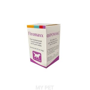 Фіромакс 80 мг для собак 10 - 16 кг, 20 табОписТаблетки круглої форми двоопуклі жовтувато-білого кольору.СкладПрепарат розроблений для собак з різною масою тіла кожна таблетка містить діючу речовину з розрахунку 5 мг фірококсибу на 1 кг маси тіла тварини.Допоміжні речовини: моногідрат лактози, мікрокристалічна целюлоза, стеарат кальцію, полівінілпіролідон, кукурудзяний крохмаль, колоїдний діоксид кремнію, порошок дріжджів.Фармакологічні властивостіATCvet QМ01АН90, нестероїдні протизапальні та протиревматичні засоби.ФІРОМАКС-нестероїдний протизапальний засіб на основі фірококсибу, що є селективним інгібітором ЦОГ-2 (циклооксигенази-2). Механізм дії фірококсибу полягає у вибірковому порушенні утворення простагландинів, що беруть участь у формуванні запальної реакції та пригніченні проліферативної та ексудативної фази запалення. Переважно діє у вогнищі запалення і дуже слабо впливає на продукцію простагландинів, що регулюють нирковий кровообіг і цілісність шлунково-кишкового тракту. Чинить протизапальну, аналгетичну та антипіретичну дії.Максимальна концентрація фірококсибу у плазмі крові собак досягається через 1,25 (0,85) години, біодоступність становить 36,9 (20,4) . Максимальна концентрація діючої речовини у плазмі крові становить 0,52 (0,22) мкгмл.період напіввиведення 7,59 (1,53) годин.Фірококсиб повністю звязується з білками крові, метаболізується в печінці і виводиться з жовчі через шлунково-кишковий тракт.ЗастосуванняДля зменшення запалення і болю при лікуванні собак при остеоартриті як протизапальний, болезаспокійливий і жарознижуючий засіб в періопераційний період (хірургічні втручання ортопедичні, Стоматологічні та на мяких тканинах).ДозуванняПрепарат застосовують собакам індивідуально одноразово перорально з кормом або примусово на корінь язика в мінімальній терапевтичній дозі: 5 мг фірококсибу на 1 кг маси тіла на добу одноразово.Залежно від маси тіла собаки фактична дозування становить:Маса тіла твариниКількість таблеток відповідного розміру на одне застосуванняЗміст фирококсиба5 10 кг1 таблетка50 мг10 16 кг1 таблетка80 мг16 25 кг1 таблетка125 мг25 45 кг1 таблетка225 мгДля собак з масою тіла більше 45 кг препарат можна дозувати за допомогою відповідної комбінації таблеток.Дотримання дієти або особливого режиму годування не потрібно. Розділення таблетки не допускається.Остеоартрит:Тривалість застосування препарату залежить від стану тварини і визначається ветеринарним лікарем.Тривале лікування (більше 90 днів) повинно проходити з обережністю і під постійним наглядом лікаря ветеринарної медицини.Хірургічні втручання:Для зменшення болю препарат застосовують за 2 години до початку операції. При необхідності лікування продовжують протягом 3 днів. Лікування собак після ортопедичного хірургічного втручання може тривати довше, що визначається ветеринарним лікарем.ПротипоказанняНе застосовувати тваринам з підвищеною чутливістю до діючої речовини або інших компонентів препаратуНе застосовувати вагітним і годуючим тваринамНе застосовувати собакам до 10 тижнів та або масою тіла менше 3 кгНе застосовувати тваринам з можливими кровотечами в травному каналі, при дискразії крові або геморагічних розладахНе застосовувати одночасно з іншими нестероїдними протизапальними препаратами або кортикостероїдамиЗастереженняПри за