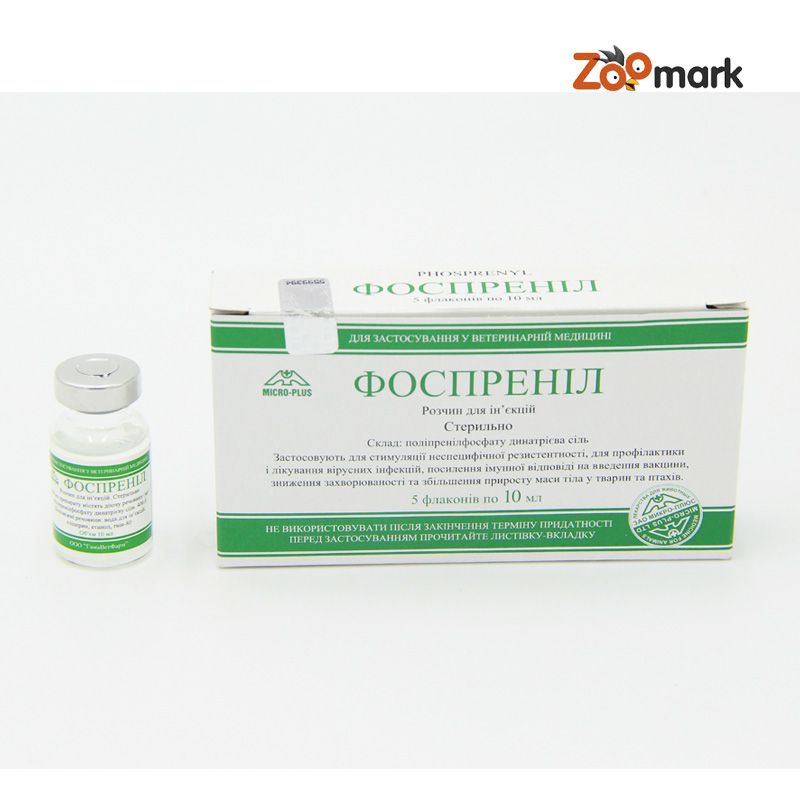 Опис препарату фоспренілФоспреніл імуномодулюючий, протизапальний препарат, який підвищує опірність до хвороб сільськогосподарських тварин, зокрема птахів. З успіхом застосовується для допомоги домашнім собакам, кішкам. Ліки отримують шляхом екстрагуванням хвої сосни.Препарат відмінно себе показав під час лікування вірусних захворювань гепатиту, ентериту, інших вірусних інфекцій. Фоспреніл підвищує імунітет, благотворно впливає на епітелій кишечника. Його протизапальні властивості використовуються навіть при лікуванні хірургічних захворювань. Широко використовується під час лікування верхніх, нижніх дихальних шляхів. Папіломи Часто бувають вірусного походження, фоспреніл з успіхом бореться з ними.Засіб випускається у пластикових або скляних пляшках різної дозування, упаковані в коробки. Дозування залежить від виду тварини, яким призначено.Фоспреніл купити можна за рецептом лікаря у ветеринарній аптеці.Рідина препарату безбарвна, іноді жовтувата, злегка переливається (опалесцирует) на світлі. Пластівці відсутні. Якщо видно осад, значить, засіб зберігалася в неналежних умовах і підлягає утилізації. Зберігати медикамент потрібно при температурі +4 - +8 градусів в темному, недоступному для дітей місці.Фоспреніл для собак може вводитися кількома способами внутрішньомязово, перорально, підшкірно і навіть краплями, які закопують в очі або ніс. Останній спосіб зручний при лікуванні цуценят. Якщо у собаки конюнктивіт або риніт, то роблять промивання цих областей розчином фоспреніла.Інструкція по застосуваннюІнструкція рекомендує дозування для собак - 0,1 мл на один кілограм живої ваги тварини. Коли захворювання йде важко, дозу збільшують удвічі і навіть утричі.Лечение для кошек проводится так же, как и собак, лишь увеличивается доза 0,2 0,3 мл на кг веса кошки. Лекарство излечивает те же болезни, что и у собак. Успешно лечатся острие кошачьи отравления.Введение лекарства через рот предполагает увеличение дозировки вдвое, т.к. половина лекарства разрушается желудочним соком. Рекомендуют закапать лекарство через нос, но коту ето сделать невозможно. Давать кошкефоспренилперорально нужно только минут за 15 до еди, не смешивая с другими препаратами. Побочних еффектов не виявлено.У кішок відсутні деякі ферменти печінки, тому вони важко переносять захворювання цього органу. Ветеринари радять збільшувати дозу ліків при гепатитах у кішок до 0,5 мл на кг живої ваги. Особливо це ефективно, коли лікують кошенят.Так як препарат виробляється з натурального матеріалу хвої, то ніяких протипоказань немає.