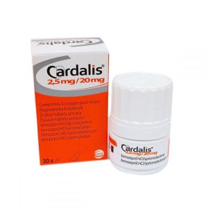 Ceva Cardalis (Кардалис) Таблетки для собак при серцевій недостатностіВетеринарний препарат для лікування застійної серцевої недостатності у собак.1 таблетка (вагою 151302604 мг) містить діючі речовини:2,5 мг беназеприлу, 20 мг спіронолактону (2,5 мг20 мг)5 мг беназеприлу, 40 мг спіронолактону (5 мг40 мг)10 мг беназеприлу, 80 мг спіронолактону (10 мг80 мг)Кардаліс випускають розфасованим в пластикові флакони по 30 таблеток, упаковані в картонні коробки.Переваги препарату для собак Ceva Cardalis (Кардаліс)Унікальна комбінація беназеприлу і спіронолактону для повноцінної блокади ренін-ангіотензин-альдостеронової системи (РААС)Більша ефективність порівняно із застосуванням лише одного беназеприлу, що зменшує прояв клінічних ознак беназеприлуБезпечний препарат (більше 8 років практичних застосувань) склад препарату схвалений Американським коледжем ветеринарної медицини (ACVIM)Жувальні таблетки (аромат яловичини, не викликає алергії) приємний смак, що забезпечує самостійне споживання препарату тваринамРекомендації по застосуваннюЯк частина стандартної терапії серцевої недостатності, як тільки зявляються клінічні ознаки (такі, як непереносимість фізичних вправ, кашель іабо задишка). Препарат застосовують перорально один раз на добу, змішуючи з невеликою кількістю корму безпосередньо перед основним годуванням.ВажливоЗастосовувати тільки в тих випадках, коли необхідно приймати одночасно обидві активнодіючі речовини у фіксованій дозі. Призначається тільки ветеринарним лікарем.Склад1 таблетка (вагою 151302604 мг) містить діючі речовини:2,5 мг беназеприлу, 20 мг спіронолактону (2,5 мг20 мг)5 мг беназеприлу, 40 мг спіронолактону (5 мг40 мг)10 мг беназеприлу, 80 мг спіронолактону (10 мг80 мг)В якості допоміжних речовин містить моногідрат лактози, мікрокристалічну целюлозу, повідон, смакову добавку яловичини, цукор прессованньй, кросповідон, стеарат магнію.ПротипоказанняНе застосовувати під час вагітності та лактації.Не застосовувати собакам, у яких виявлено гіпоадренокортицизм, гіперкаліємію або гіпонатріємію.Не застосовувати разом із нестероїдними протизапальними препаратами собакам з нирковою недостатністю.Не застосовувати у разі гіперчутливості до інгібіторів ангіотензинперетворюючого ферменту (інгібіторів АПФ) або до будь-якої з допоміжних речовин препарату.Не застосовувати у випадках порушення серцевого викиду через аортальний або легеневий стеноз.ЗберіганняЗберігати окремо від продуктів харчування та кормів, у недоступному для дітей місці за температури від 5 до 25С.Термін придатності2 роки.Після відкриття, препарат слід використати протягом 6 місяців.Рекомендовано відпуск препарату за рецептом лікаря ветеринарної медицини.