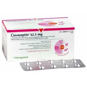 Клавасептин - це противоинфекционний препарат. Він призначений для лікування або додаткового лікування періодонтальних інфекцій у собак і лікування шкірних інфекцій у кішок.Склад:Клавасептин 62,5 мг таблетки для лікування кішок і собак, що містять: 50 мг амоксициліну (у вигляді тригідрату) 12,5 мг клавуланової кислоти (у вигляді солі калію).Клавасептин 250 мг таблетки для лікування собак, що містять: 200 мг амоксициліну (у вигляді тригідрату) 50 мг клавуланової кислоти (у вигляді солі калію).Показання до застосування:Лікування кішок і собак при захворюваннях шкіри (включаючи лікування глибокої та поверхневої піодермії), мяких тканин порожнини рота (наприклад, гингивит), мочевиводящих путей, органов дихания (включая заболевания верхних и нижних дихательних путей), пищеварительного канала (ентерити), визванних микроорганизмами, чувствительними к амоксициллину и клавулановой кистоти.Дозировка и способ применения:Препарат назначают в дозе 12,5 мг на 1 кг масси животного дважди в день.При тяжелих инфекциях дозу можно удвоить до 25 мг на 1 кг масси животного дважди в день.Продолжительность лечения: 7 дней для лечения пародонтальних инфекций у собак от 7 до 14 дней для лечения кожних инфекций у кошек (включая рани и абсцесси).Клинический статус животних следует повторно оценить через 7 дней, и лечение продолжится еще на 7 дней, если ето необходимо.Детальная дозировка:Клавасептин 62,5 мг - 1 таблетка на 5 кг масси тела.Клавасептин 250 мг - 1 таблетка на 20 кг масси тела.Противопоказания:Не использовать в случае гиперчувствительности к пенициллинам или другим веществам группи -лактам или к любому из ексципиентов. Только для кошек и собак. Не применять другим животним. Не використовувати у тварин з серйозною дисфункцією нирок, що супроводжуються анурією або олигуарией. Не використовувати у випадках відомої резистентності до комбінації амоксициліну та клавуланової кислоти.Форма випуску:Таблетки розфасовані в блістері по 10 шт. В упаковці 10 або 25 блістерів.