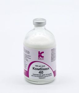 КОМБІКЕЛ 40 (Combikel 40)- суспензія від білого до світло-жовтого кольору, в 1 мл якої міститься 200000 ME прокаїну бензилпеніциліну та 200 мг дигідрострептоміцину сульфату.Препарат випускають розфасованим по 50, 100 та 250 мл у флакони нейтральногоскла.Фармакологічні властивостіПеніцилін має високу антибіотичну активність головним чином щодогрампозитивних мікроорганізмів (стрептококів, пневмококів, стафілококів, дифтерійних та сибіркоязових паличок, клостридій),грамнегативних коків, спірохет та деяких патогенних грибів.Резистентними до дії пеніциліну є грамнегативні мікроорганізми, рикетсії, віруси, найпростіші та багато грибів.До дії пеніциліну стійкі штамистафілококу, кишкової палички, синьогнійної палички та інших мікроорганізмів, щоутворюють фермент пеніциліназу.Пеніцилін у формі прокаїну бензилпеніциліну створює спочатку високу концентрацію пеніциліну в тканинах.Дигідрострептоміцину сульфат пригнічує ріст та розвиток сальмонел, пастерел, ешерихій, кокової мікрофлори.Не діє на анаеробні бактерії, гриби, віруси та найпростіші.Комбінація діючих речовин у препараті значно посилює їхню антибактеріальну дію.ЦІЛЬОВЕ ВИКОРИСТАННЯ:Велика рогата худоба, свині, собаки, кішки.Дози та спосіб застосуванняКОМБІКЕЛ 40 застосовують внутрішньомязово або підшкірно для лікування інфекцій, викликаних чутливими до пеніциліну та (або) дигідрострептоміцину сульфату мікроорганізмами захворювання органів дихання (геморагічна септицемія, пастерельоз, бронхопневмонія, риніт, ларине, ендометрит), шкірних інфекцій і ран, перитоніту, маститів, менінгіт (стрептококовий), поліартритів, абсцесів, отитів, пики свиней правця, сибірки, клостридіозів, некробактеріозу, актином ікозу, пупкового сепсису, пупкового сепсису, пупкового сепсису, метрит- мастит-агалактія (ММА) у свиней, коней, великої рогатої худоби, собак, котів у наступних дозах:Вид тварин Разова дозаВелика рогата худоба, коні 1 мл препар 1 мл препарату на 10-20 кг маси тіла тварини один раз на деньСобаки , кішки 1 мл препар 1 мл препарату на 10-20 кг маси тіла тварини один раз на деньСвині, вівці, кози 1 мл препар 1 мл препарату на 10-20 кг маси тіла тварини один раз на деньПри введенні препарату інодівиявляютьсяАлергічні реакції,що швидко розвиваються.Лікування алергічних реакцій: глюкокортикостероїди або антигістаміни.Можливі нервові явища, нейромязова блокада, блювання, лихоманковий стан, аборти у свиней.Тривале застосування препарат може призводити до глухоти, вестибулотоксичних та нефротоксичних симптомів.Недопускається застосування препарату при індивідуальній підвищеній чутливості до одного з компонентів.Не застосовувати лактуючим тваринам, якщо молоко використовується для харчових цілей.Не застосовувати внутрішньовенно.Не застосовувати тваринам із нирковою недостатністю.Забійтварин на мясо не раніше, ніж через 30 діб після останнього введення препарату.Мясо тварин, вимушено вбитих до закінчення зазначеного терміну, може бути використане на корм мясоїдним або для мясо-кісткового борошна.Молоко забороняється використовувати для харчових цілей упродовж 4 днів після останнього введення препарату.До цього терміну молоко використовують у корм тваринам.Необхідно струшувати флакон перед застосуванням та використовувати лише сухий шприц.Не використовувати одночасно з іншими медик