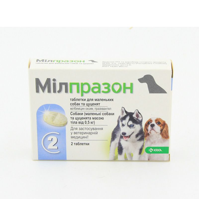 Опис Милпразон для собакДля боротьби з гельмінтами багато ветеринари пропонують Милпразонкупить і робити це регуярно, раз у три місяці. Препарат призначається щеночкам і собачкам, з урахуванням вагової категорії.Милпразонобладаетцестодоциднимиинематодоциднимисвойствами і використовується для дегельмінтизації собак.Мильбемицинаоксим ипразиквантелвиступают діючими речовинами у складі ліки. Ці компоненти ефективні проти личинок та статевозрілих червяків.Таблетки дають пероральним способом, індивідуально кожній тварині. Схему прима і покладену норму прописує інструкція. Лечениюантигельминтнимпрепаратом не підлягають: собаки з хворобами нирок, віком до 2 тижнів, виношували і годуючі потомство, з захворюванням печінки, истощнние особини. ПереноситсяМилпразонхорошо і не надає токсичного впливу, але може викликати діарею, пасивність і блювоту у чутливих тварин.Милпразон - комбінований антигельмінтивний препарат нематоцидного і цестоцидного дії. Діючі речовини, які входять до складу препарату, що обумовлюють його широкий спектр антигельмінтного дії.Склад:Одна таблетка містить діючі речовини:Милбемицина оксим - 2,5 мгПразиквантел - 25 мг. Допоміжні речовини:целюлоза мікрокристалічна, натрію кроскармелоза, повідон, лактоза моногідрат, кремній колоїдний безводний, магнію стеарат, ароматизатор мяса, порошок дрожжейВсе таблеткиМилпразонимеют привабливий для тварин смак мяса.Милпразонназначают для лікування, дегельмінтизації та профілактики при захворюваннях, викликаних як личинкові формами, так і статевозрілими цестодами - Dipylidium caninum, Taenia spp., Echinococcus spp., Mesocestoides spp. і нематодами - Ancylostoma caninum, Toxocara canis, Toxascaris leonina, Trichuris vulpis, Thelazia callipaeda Angiostrongylus vasorum (знижує інтенсивність зараження), Crenosoma vulpis (знижує інтенсивність зараження), Dirofilaria immitis (профілактика захворювання), у т. ч. при нематодозах, цестодозах комбінованих нематодо-цестодозних інвазіях.Виробник: KRKA, d.d., Novo mesto, Словенія.