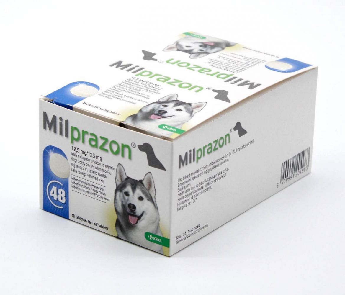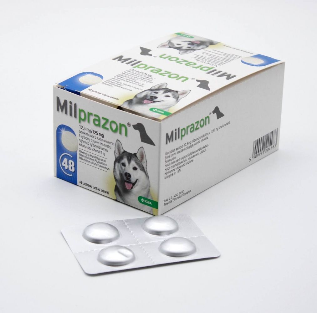 ОписМілпразон - комбінований антигельмінтний препарат нематоцидна і цестоцидна дії. Діючі речовини, що входять до складу препарату, обумовлюють його широкий спектр антигельмінтної дії.Таблетки для собак в модифікації для цуценят і маленьких собак вагою до 5 кг представляють собою овальні, двоопуклі таблетки зі смаком мяса жовтувато-білого кольору з коричневими вкрапленнями та рискою на одному боці. Розфасований по 2 або 4 таблетки в блістери з фольги, упаковані в картонні коробки в комплекті з інструкцією із застосування.СкладОдна таблетка містить діючі речовини:Мілбеміцина оксим - 2,5 мгПразиквантел - 25 мг.Допоміжні компоненти: мікрокристалічна целюлоза, натрію кроскармелоза, повідон, лактоза моногідрат, кремній колоїдний і магнію стеарат, ароматизатор мяса, порошок дріжджівВсі таблетки Мілпразон мають привабливий для тварин смак мяса.Фармакологічні властивостіМілпразон таблетки для собак відносяться до групи комбінованих антигельмінтних лікарських препаратів нематодоцидної і цестодоцидної дії.Активні компоненти, що входять до складу препарату,забезпечують його широкий спектр антигельмінтної дії.Мільбеміцина оксим - макроциклічний лактон, що отримується в результаті ферментативної діяльності Streptomyces hygroscopicus var. Aureolacrimosus, активний відносно личинок і імаго нематод, паразитуючих в шлунково-кишковому тракті собак, а також личинок Dirofilaria immitis.Механізм дії мільбеміцина обумовлений підвищенням проникності клітинних мембран для іонів хлору (Cl-), що призводить до надмірної поляризації мембран клітин нервової і мязової тканини, паралічу і загибелі паразита. Максимальна концентрація мільбеміцина оксима в плазмі крові собак досягається протягом 2-4 годин, біодоступність становить близько 80. З організму зєднання виводиться в основному в незміненому вигляді.Празиквантел є ацілированим похідним піразинізохіноліна, володіє вираженою дією проти цестод і нематод. Підвищуючи проникність клітинних мембран паразита для іонів кальцію (Ca2 +), викликає деполяризацію мембран, скорочення мускулатури і руйнування тегумента, що призводить до загибелі паразита і сприяє його виведенню з організму тварини. Максимальна концентрація празиквантель в плазмі крові собак досягається через 1-4 години. Зєднання піддається швидкої і практично повної біотрансформації в печінці. Рівень звязування в плазмі становить близько 80, виводиться з організму протягом 2 діб в основному з сечею.Мілпразон таблетки для собак за ступенем впливу на організм відносяться до речовин малонебезпечних (4 клас небезпеки по ГОСТ 12.1.007-76), в рекомендованих дозах не надають сенсибілізуючої, ембріотоксичної і тератогенної дії, добре переносяться собаками різних порід і віку. Препарат токсичний для бджіл, а також риб і інших гідробіонтів.Рекомендації щодо застосуванняТаблетки для собак призначають з лікувальною і профілактичною метою при нематодозах, цестодозах і асоціативних нематод-цестодозних інвазіях, викликаних гельмінтами наступних видів: цестоди - Dipylidium caninum, Taenia spp., Echinococcus spp., Mesocestoides spp . нематоди - Ancylostoma caninum, Toxocara canis, Toxascaris leonina, Trichuris vulpis, Thelazia callipaeda Angiostrongylus vasorum (знижує інтенсивність зараження), Crenosoma vulpis (знижує інтенсивність зараження), Dirofilaria immitis (профілактика захворювання).Спосіб застосування та дозиМілпразон таблетки для собак застосовують одноразово п