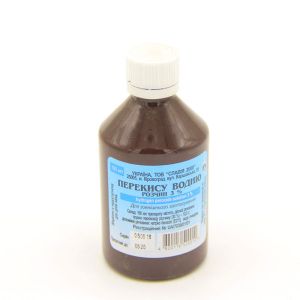 100 мл препарату містять водню пероксиду розчину 30 - 10,0 г допоміжні речовини: натрію бензоат (Е 211), вода очищена.Лікарська форма. Розчин для зовнішнього застосування 3 , водний.Фармакотерапевтична група. Антисептичні та дезінфікуючі засоби. Протипоказання. Підвищена чутливість до препарату. Належні заходи безпеки при застосуванні. Застосування розчину на повязку забезпечує безболісне зняття її з рани. Велика кількість піни утворюється, сприяє механічному очищенню рани від гною і тканинного детриту. Перекису водню розчин слід з обережністю застосовувати для обробки глибоких ран та зрошення порожнин, враховуючи можливість емболій. Препарат нестабільний у лужному середовищі, у присутності металів, складних радикалів деяких оксидантів, а також на світлі і в теплі. Слід уникати попадання розчину в очі. Спосіб застосування та дози. Водню пероксид наносять на ушкоджену ділянку шкіри для дезінфекції ран per se (т. e. без розведення). Для полоскання розчиняють 1 столову ложку в 1 склянці води для аплікацій, обробки ранових поверхонь, зупинки кровотечі (капілярної) уражені ділянки обробляють тампоном, просоченим розчином водню пероксиду. Тривалість лікування залежить від досягнутого ефекту.Побічні ефекти. Можливе відчуття печіння в момент обробки рани. У деяких випадках при індивідуальній чутливості до компонентів препарату можливе виникнення місцевих алергічних реакцій. При тривалому застосуванні для обробки слизової оболонки рота можлива гіпертрофія сосочків язика. Умови зберігання. Зберігати при температурі не вище 25С в захищеному від світла місці. Зберігати в недоступному для дітей місці. Термін придатності - 2 роки.Як купити Перекис водню 100млОформити замовлення через корзинуОформити замовлення по контактним телефонам